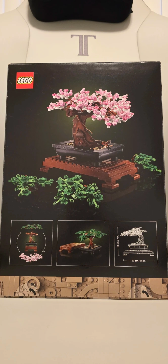 LEGO Botanical Collection Bonsai Tree building set. Features 878 pieces. Finished dimensions are 20 cm / 7.5 inches tall. Includes green leaves for a full bloom or traditional pink cherry blossoms.