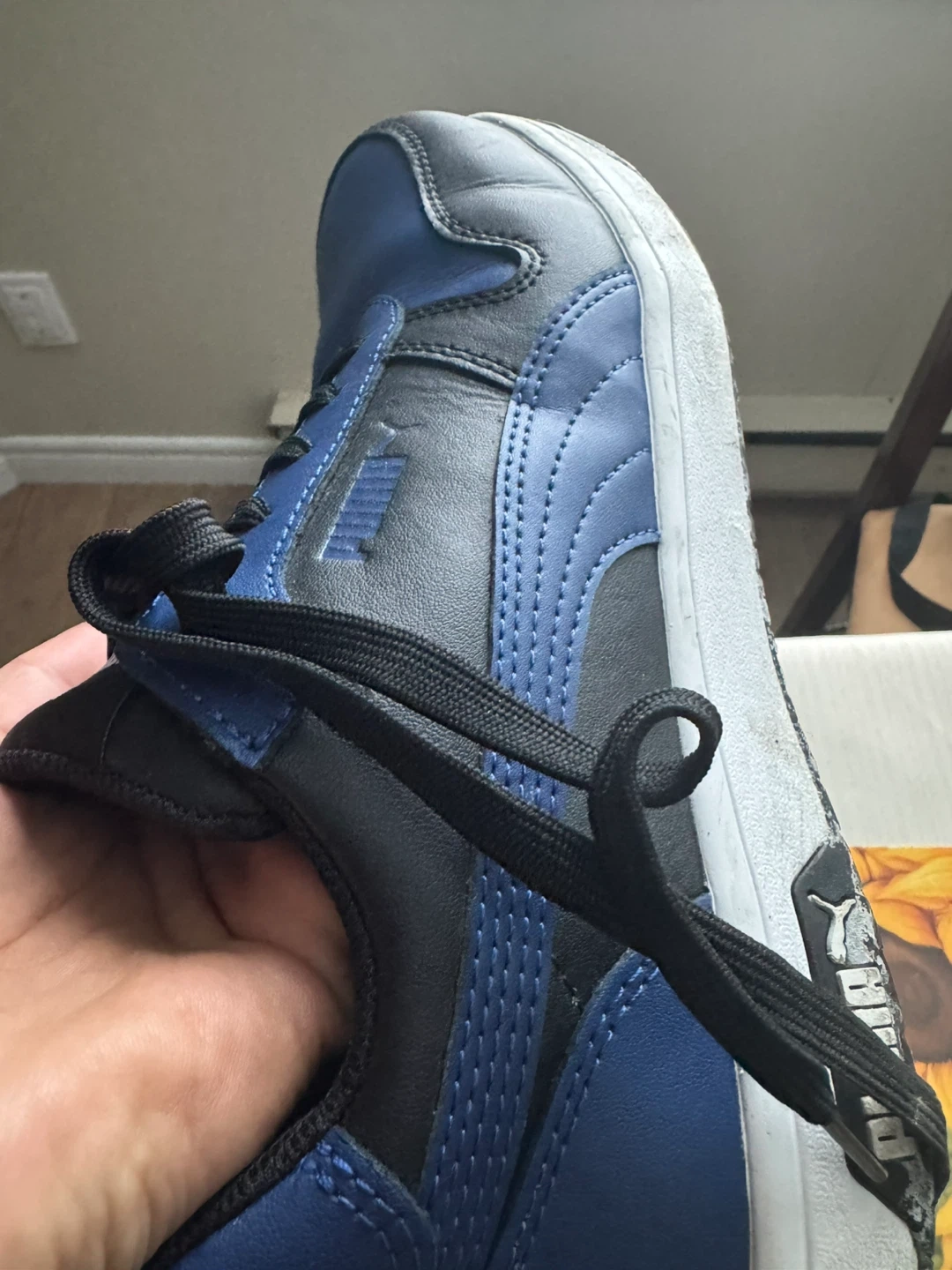 These Puma sneakers are black with blue accents. They have a classic lace-up closure. Durable rubber sole provides good traction.