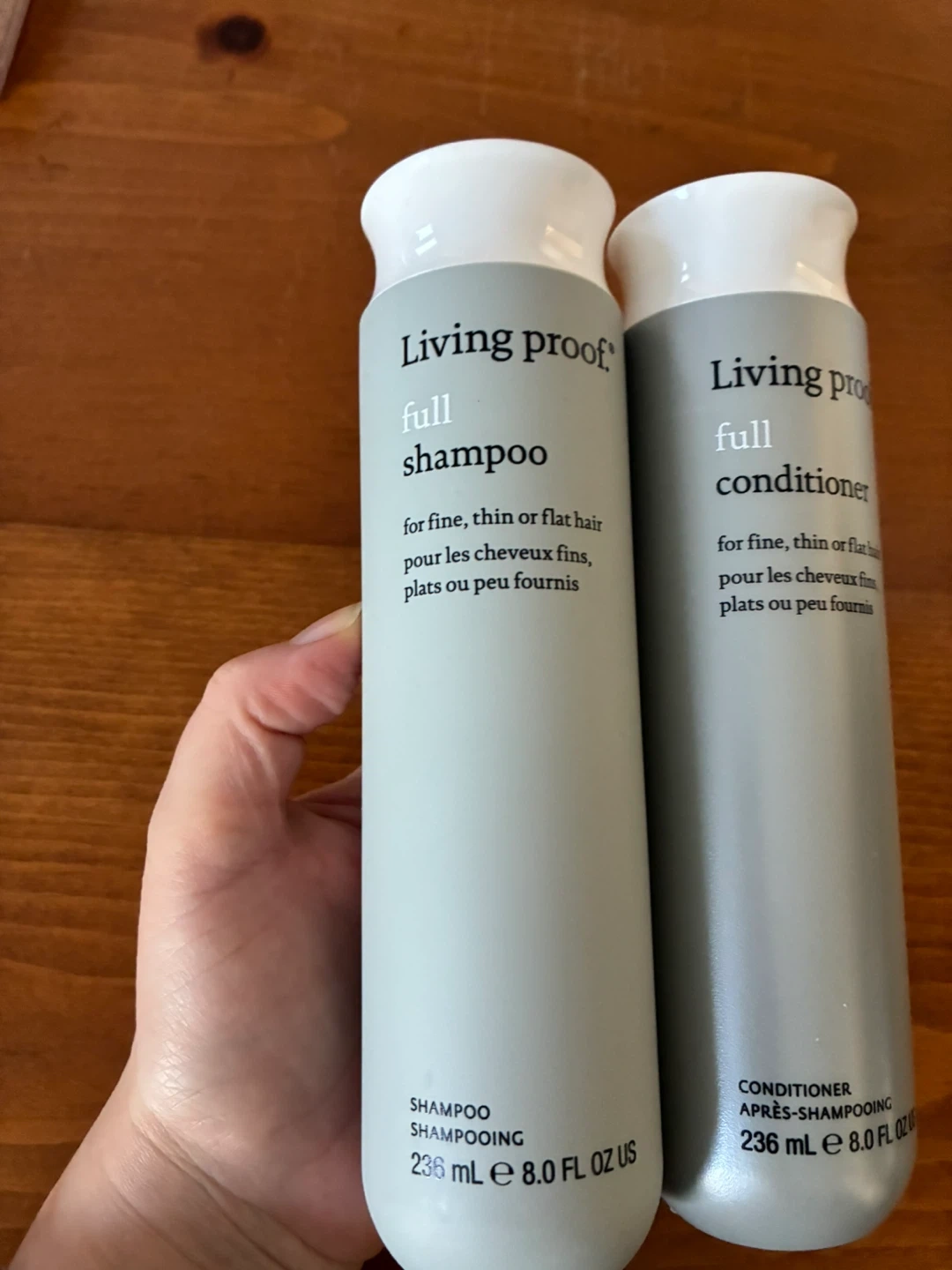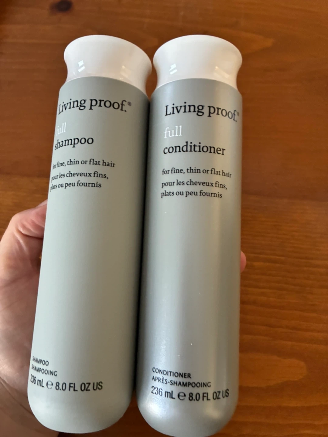 This set includes Living Proof Full Shampoo and Full Conditioner. Both are formulated for fine, thin, or flat hair. Each bottle contains 8.0 fl oz.
