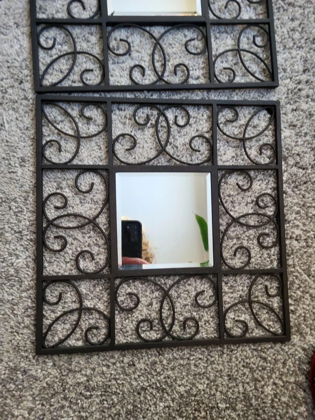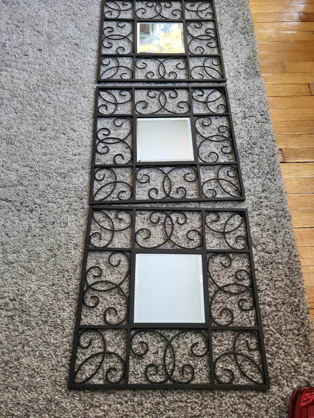 Decorate your walls with this set of three square mirrors. Each mirror features a black metal scrollwork frame. They're perfect for adding a touch of elegance to any room. Great for entryways or living spaces!