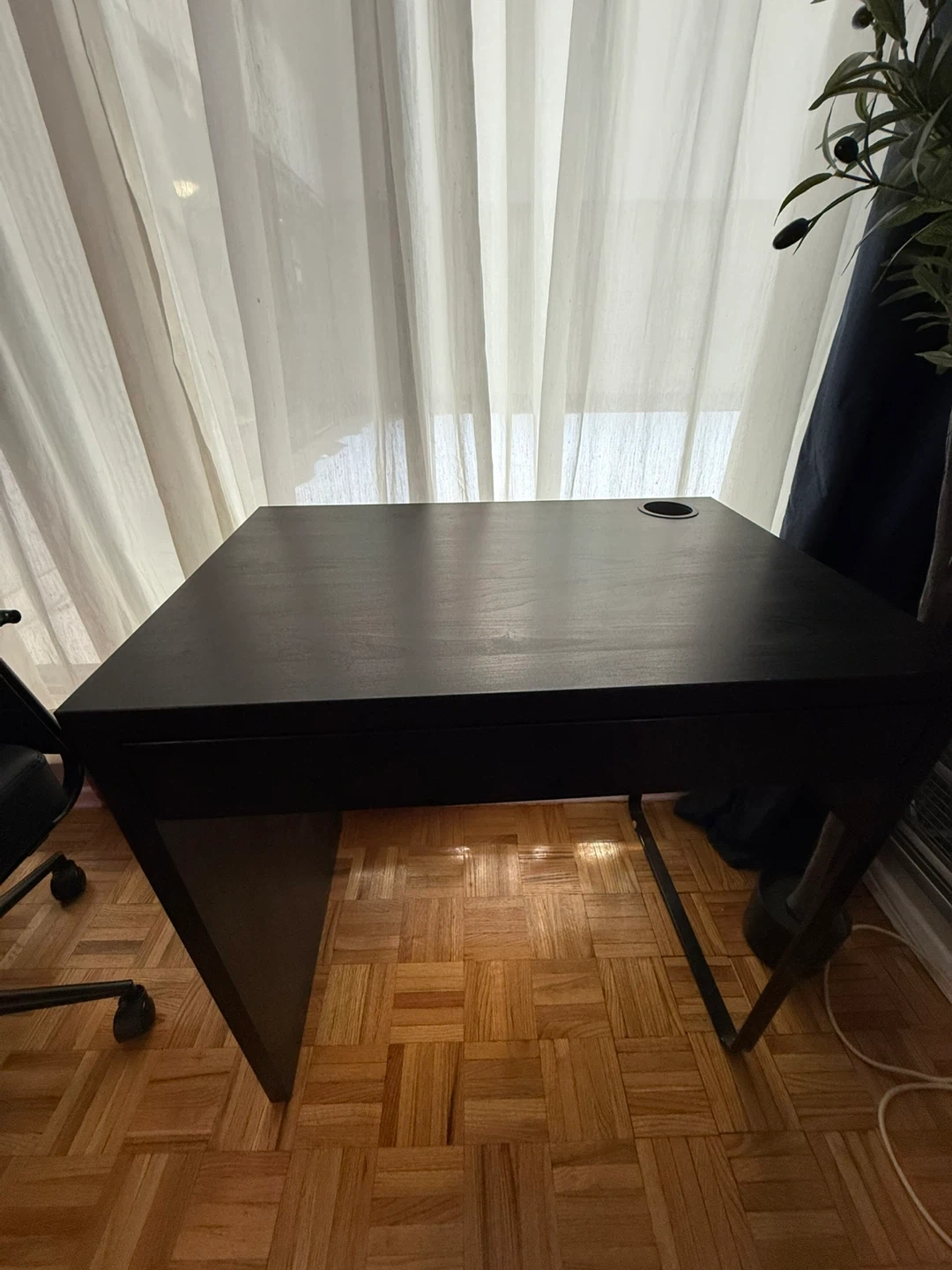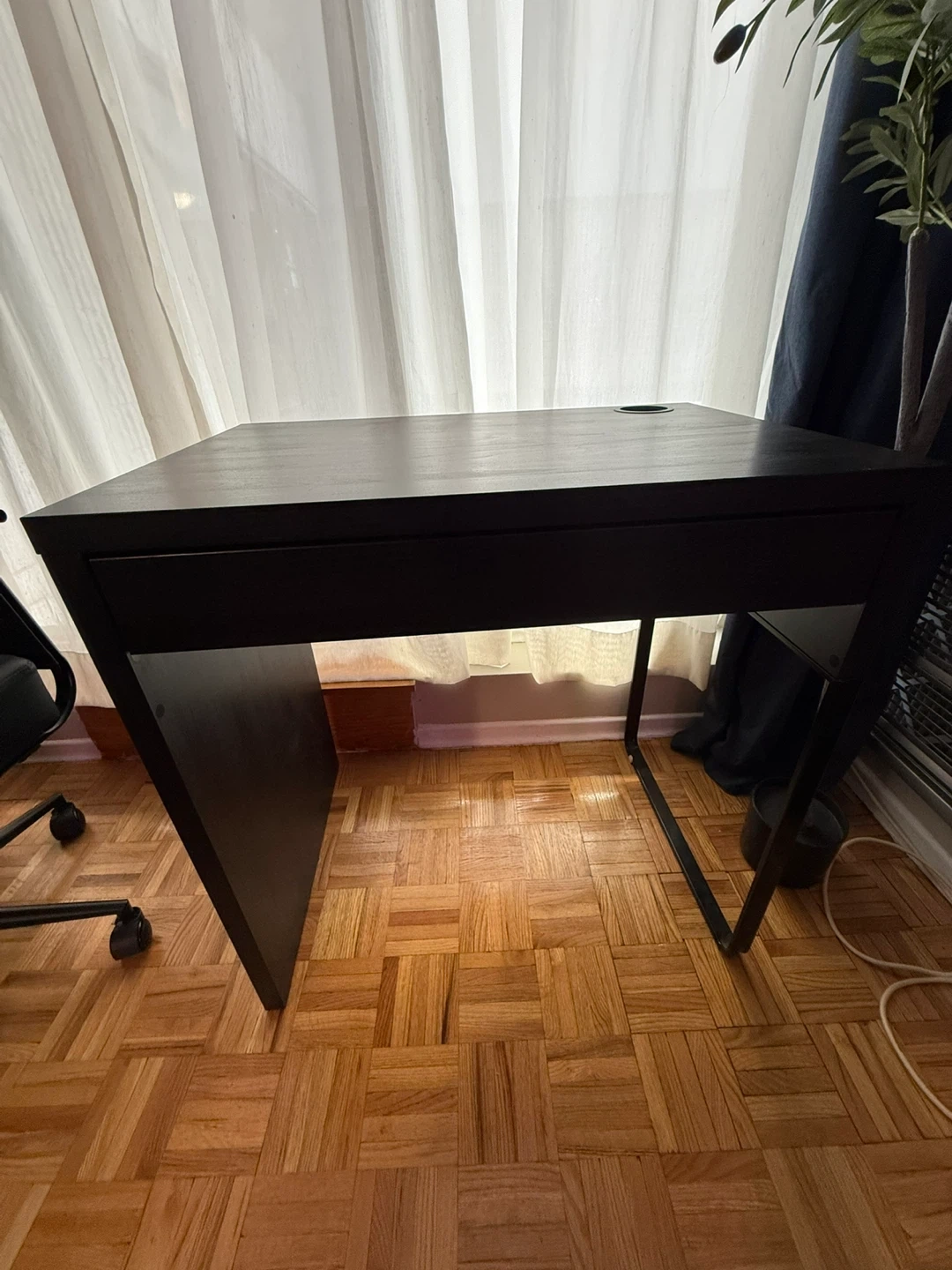 This is a black desk from IKEA. It features a single drawer for storage. Perfect for a smaller workspace or as an accent piece.