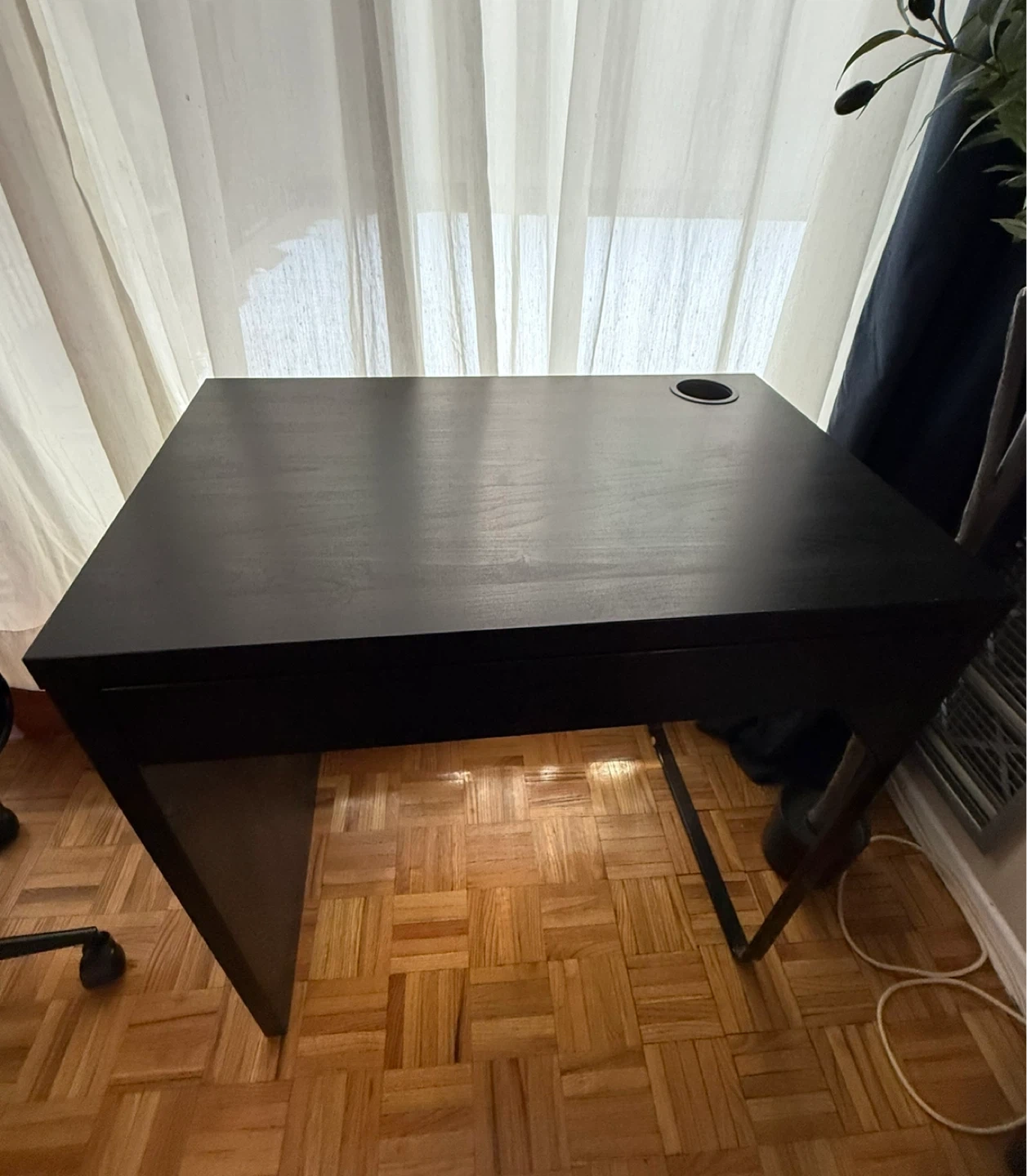This is a black desk from IKEA. It features a single drawer for storage. Perfect for a smaller workspace or as an accent piece.