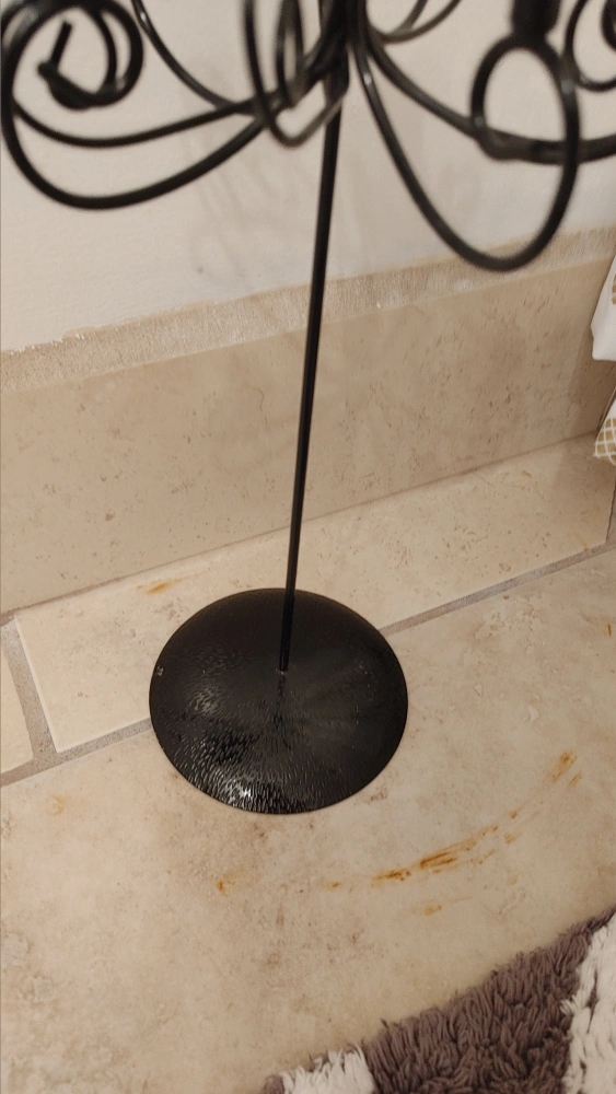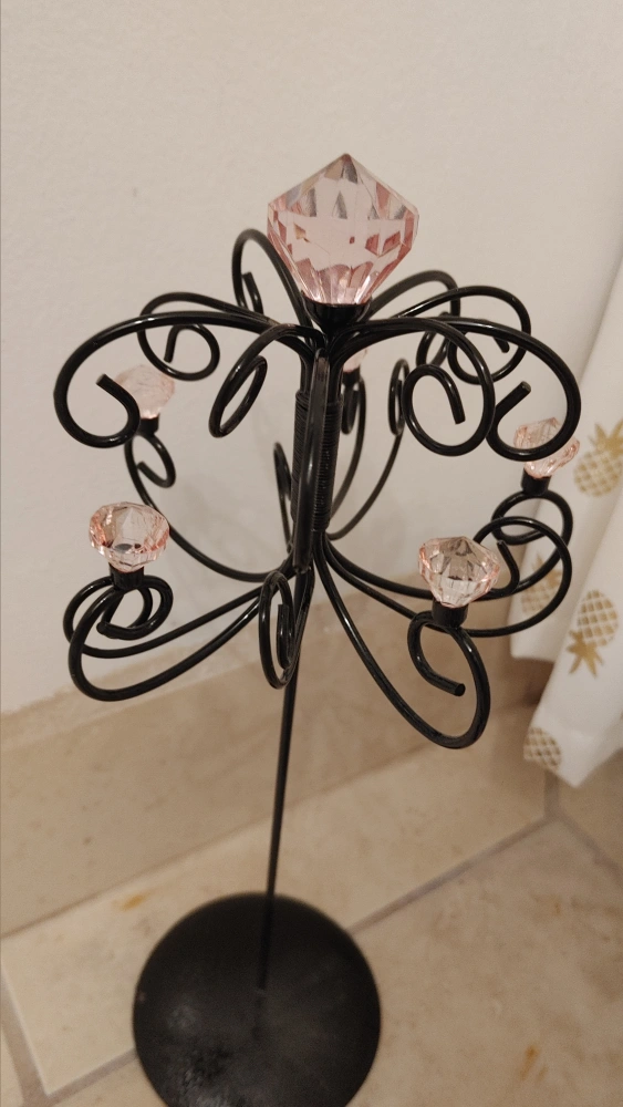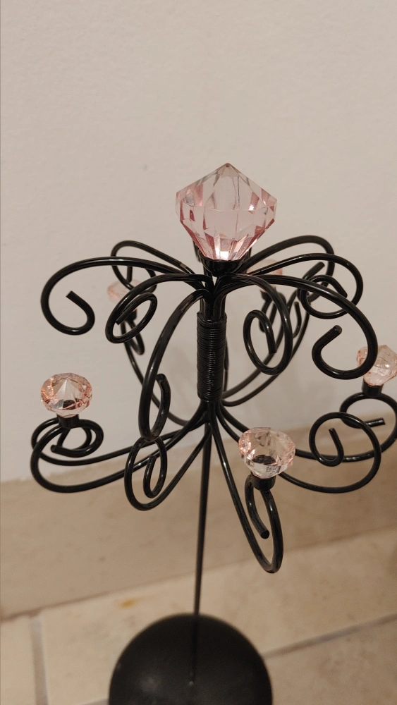 Black metal jewelry stand with pink crystals
