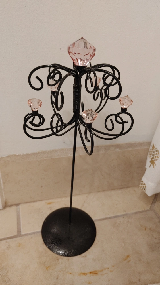Black metal jewelry stand with pink crystals