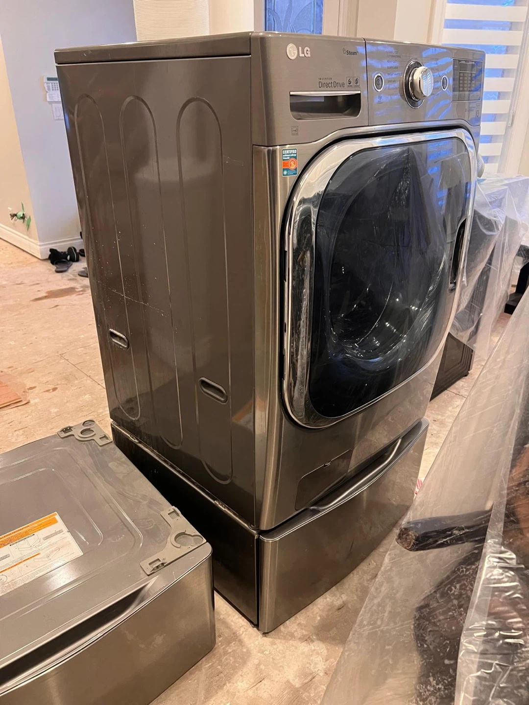 LG Direct Drive front load washing machine in a dark grey finish. It's a 120V, 60 Hz, 10 A appliance. Features automatic washing with steam. Made in Korea. This is a great appliance for busy households!