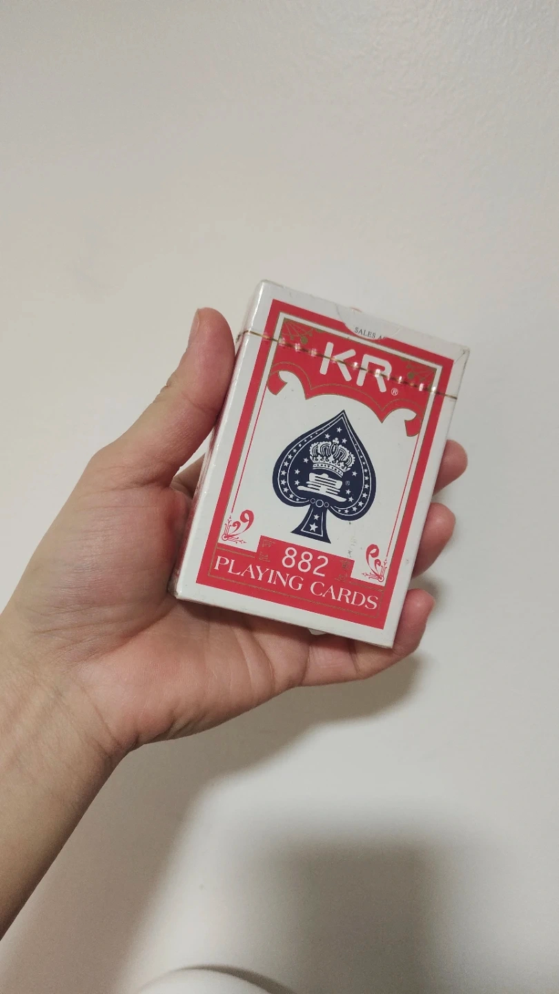 This is a deck of KR 882 playing cards. The box is red and white with gold accents. Perfect for a game night with friends!