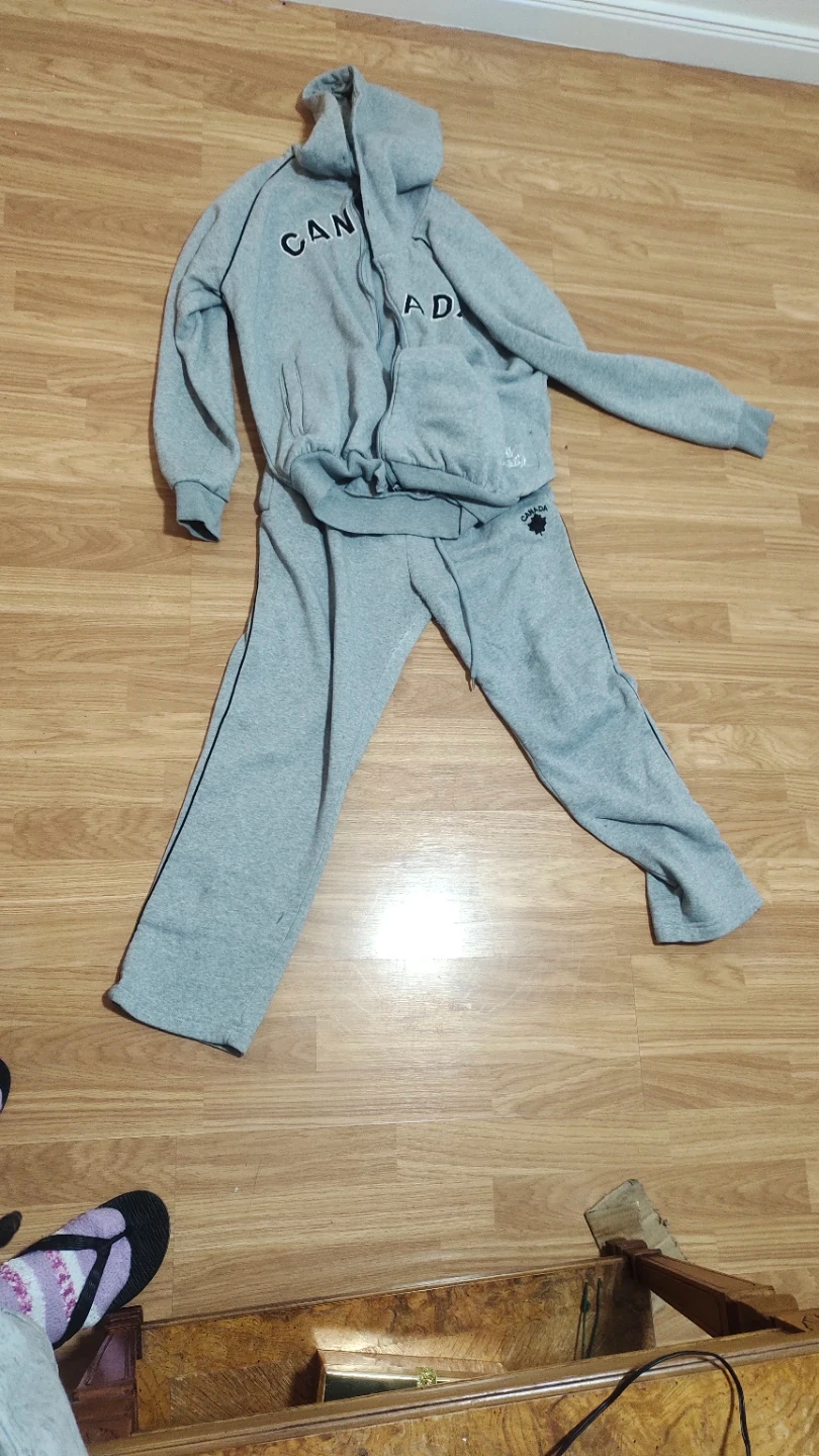 This is a grey sweatsuit set with Canada written across the chest of the hoodie. It's a comfortable and casual outfit. The pants have a black stripe down the side.