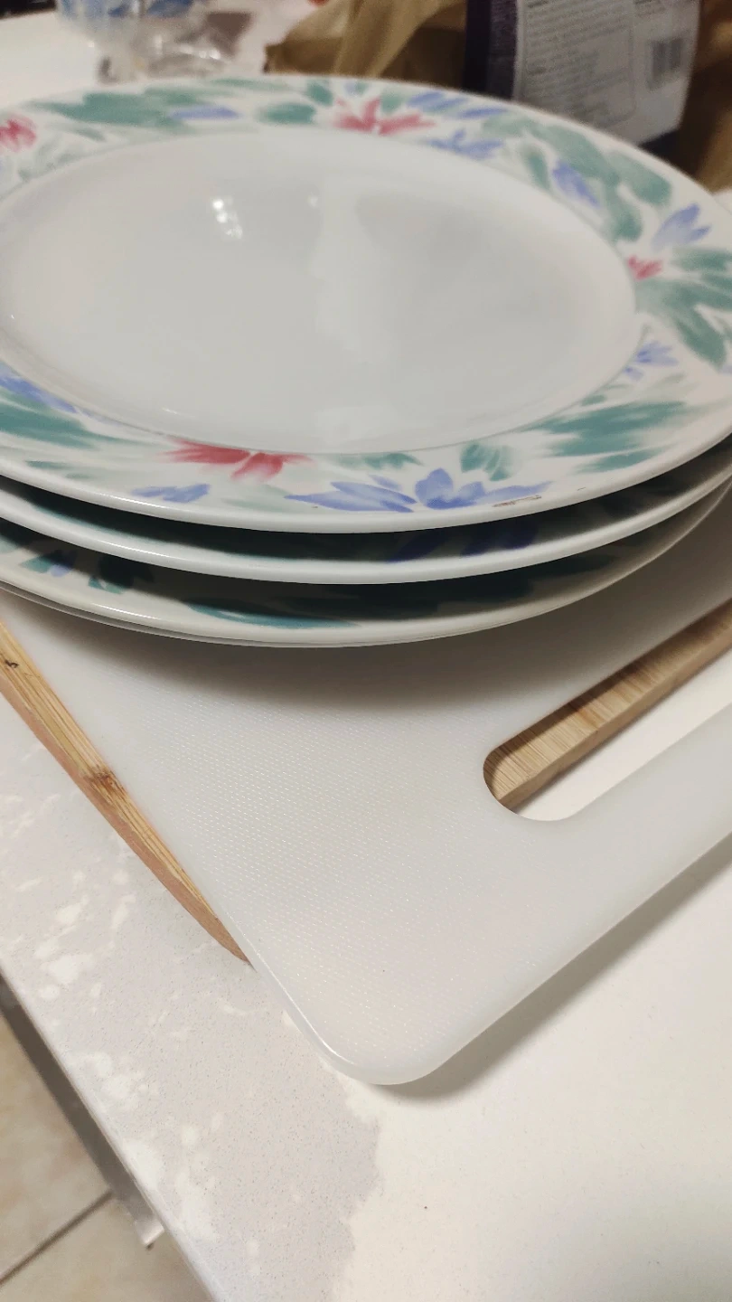 These are three dinner plates featuring a floral pattern with blue, pink, and green accents. They're made of ceramic. Use these for everyday meals or special occasions!