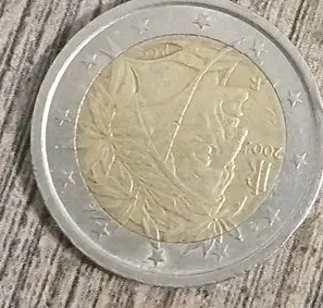 A 2 Euro coin from 2002. This coin is bi-metallic with a copper-nickel outer ring and a nickel-brass inner core. It features a portrait on the obverse. A single coin is for sale.