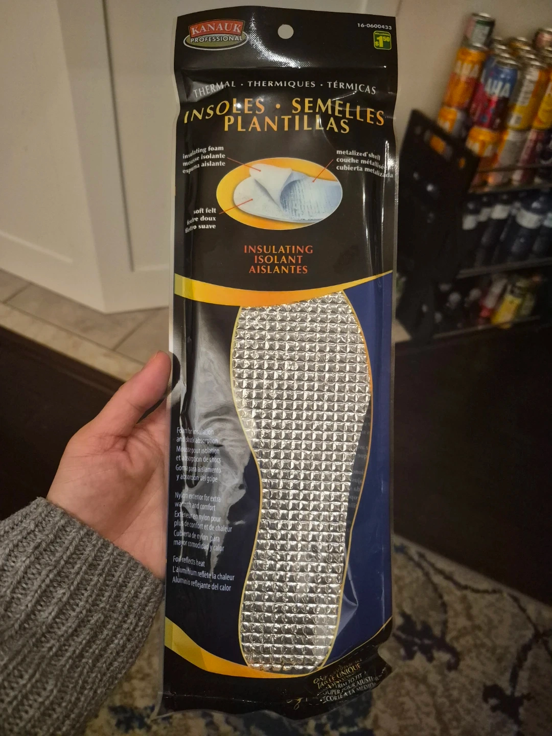 These Kanauk Professional thermal insoles are designed for warmth and comfort. They feature insulating foam for shock absorption and a nylon exterior. The foil reflects heat to keep your feet warm. Derry & McLaughlin pickup.