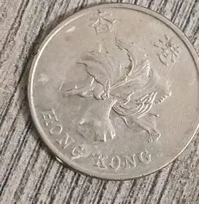 A Hong Kong one dollar coin from 1992. Features a floral design on one side and the denomination on the other. Made of metal.
