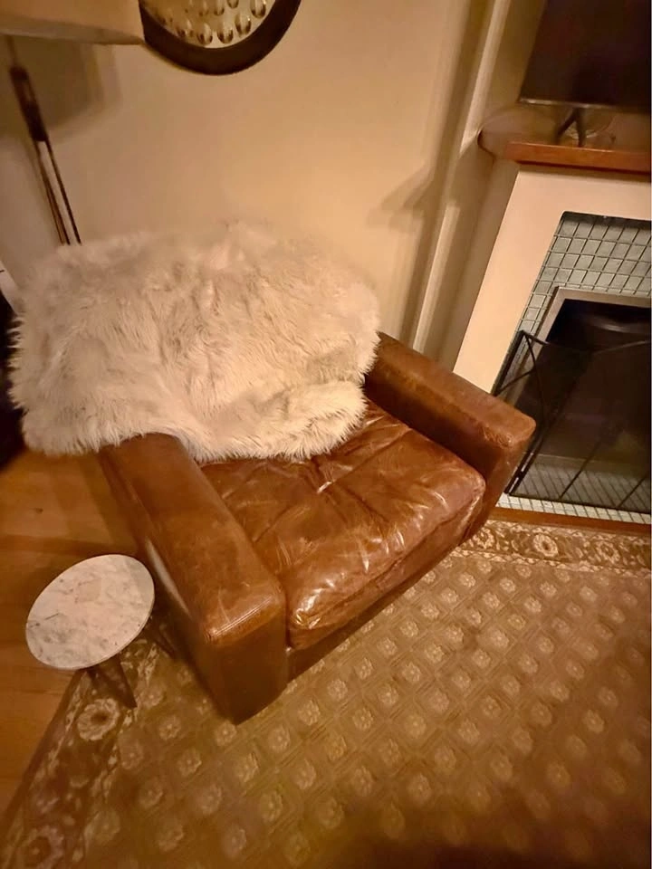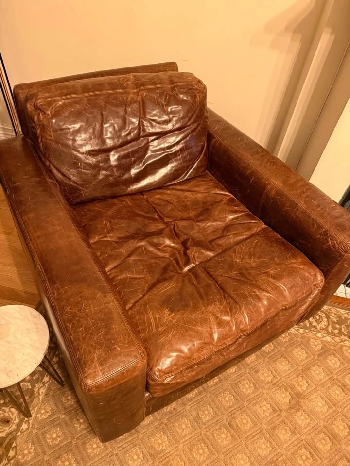 This is the Maxwell distress leather. If you scratch it, it’s absorbed into the leather and looks more weathered. Supposed to be the intended look. Matching oversized 9 foot sofa if interested.