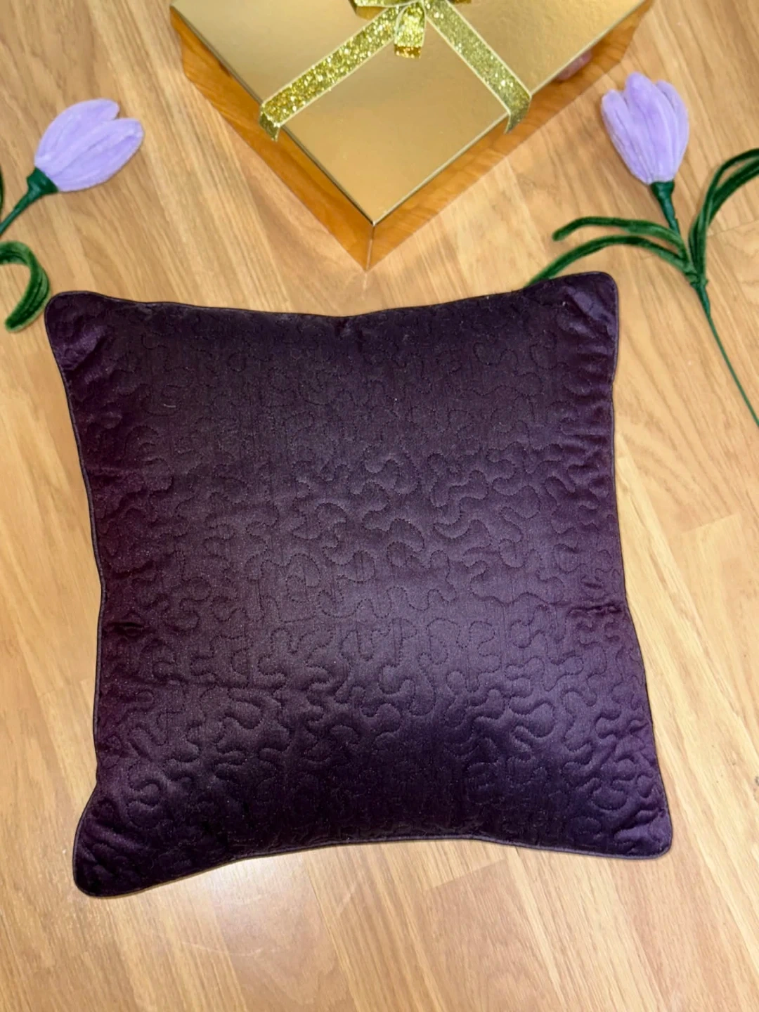 This decorative pillow is a lovely accent piece. It features a beautiful embroidered feather design on one side. The pillow's shimmering purple fabric adds a touch of elegance to any room. $5 each