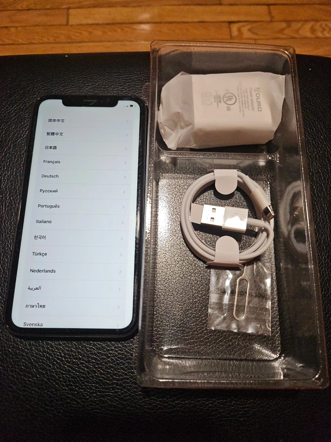 This is an Apple iPhone XR with 128 GB of storage. It's black and comes with its original charging cable, power adapter, and SIM ejector tool. The phone is in its original box.