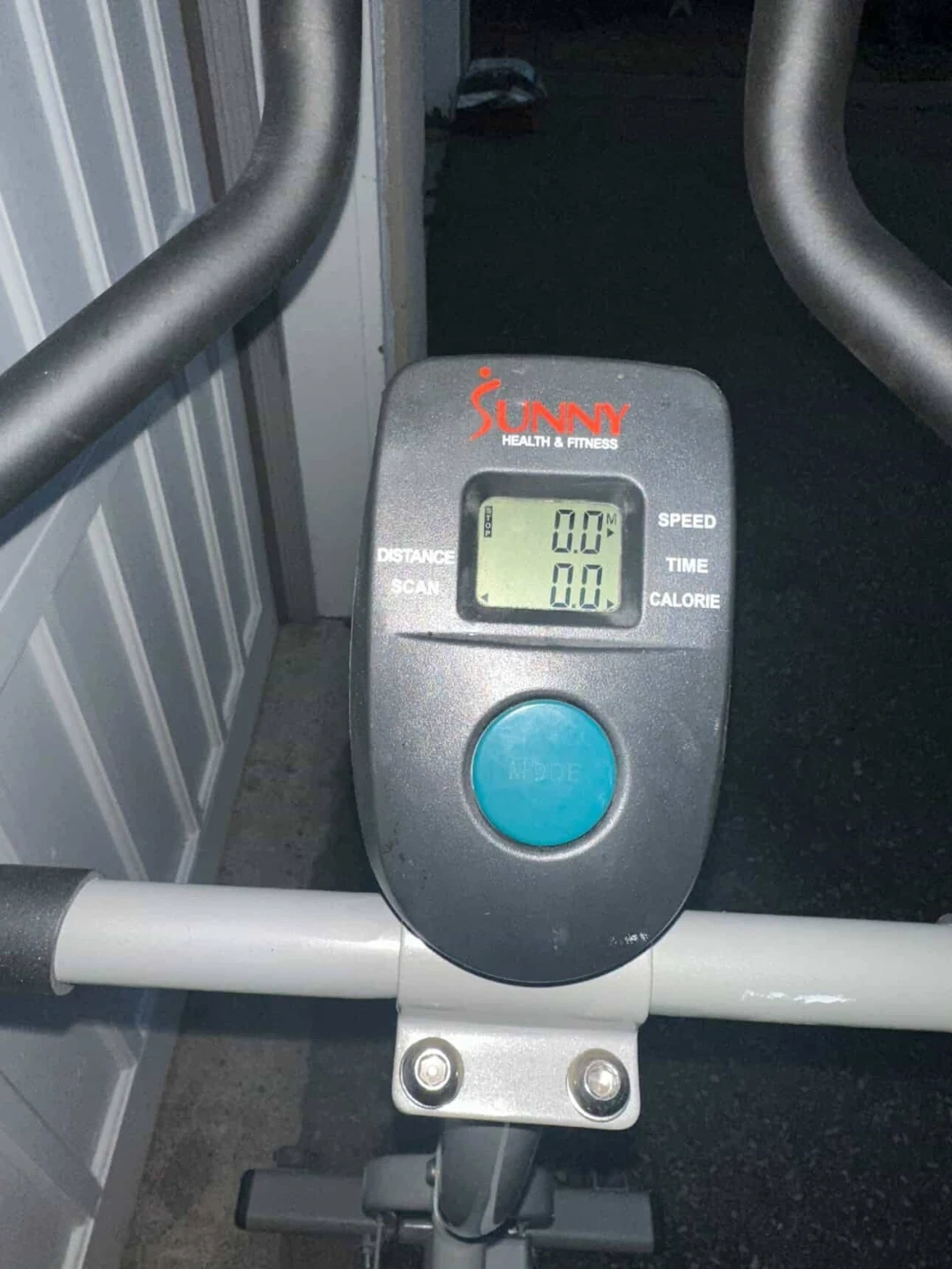 Sunny Health & Fitness stationary exercise bike, model SF-B1203. It features a digital display showing speed, distance, time, and calories. Perfect for home workouts!
