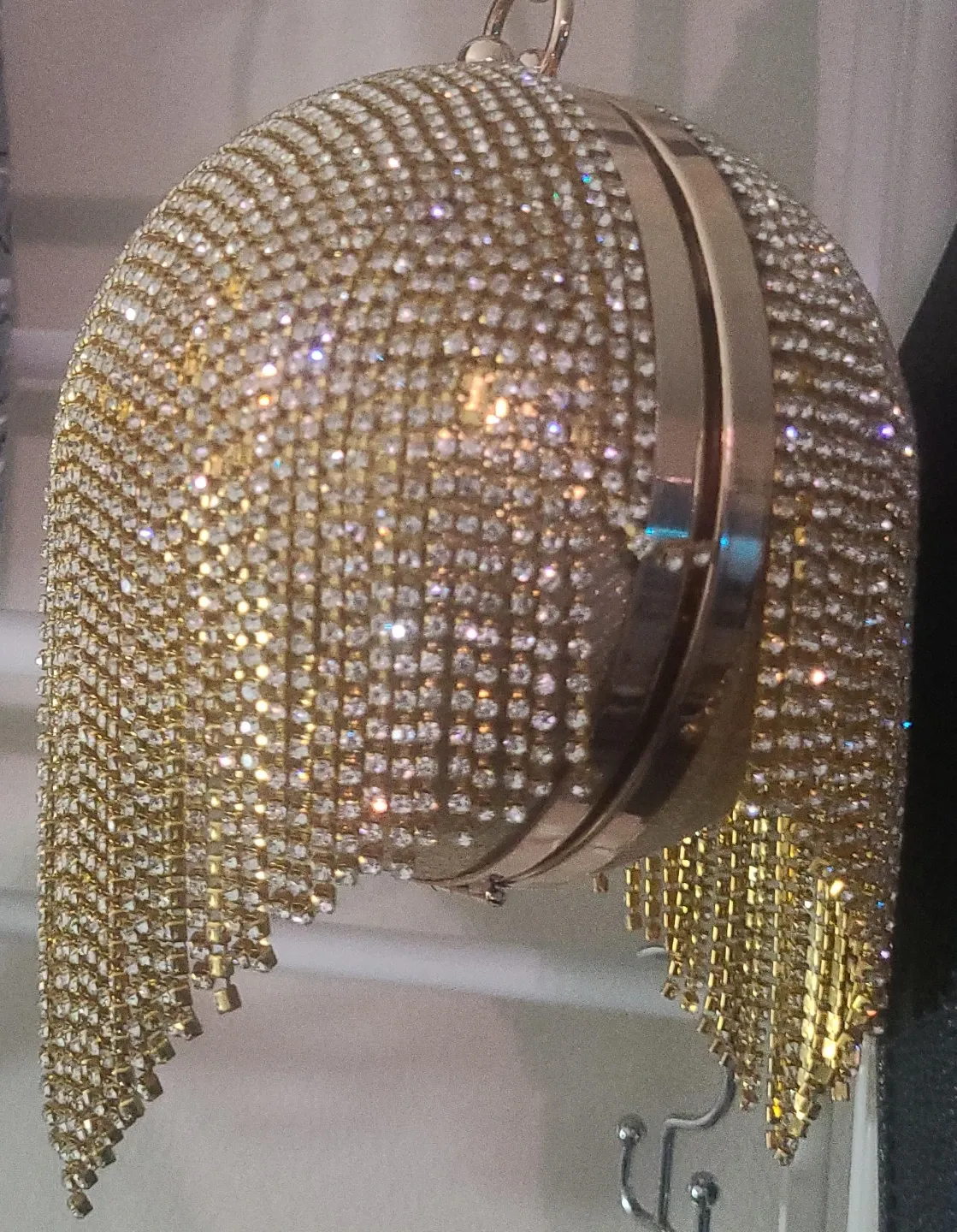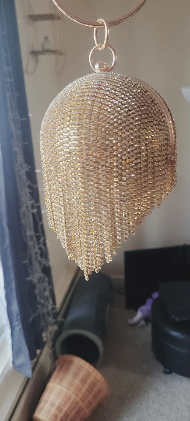 This unique ball-shaped clutch purse is covered in sparkling rhinestones and features a draped fringe detail. It has a rose gold frame and clasp closure. The interior is lined with satin fabric.