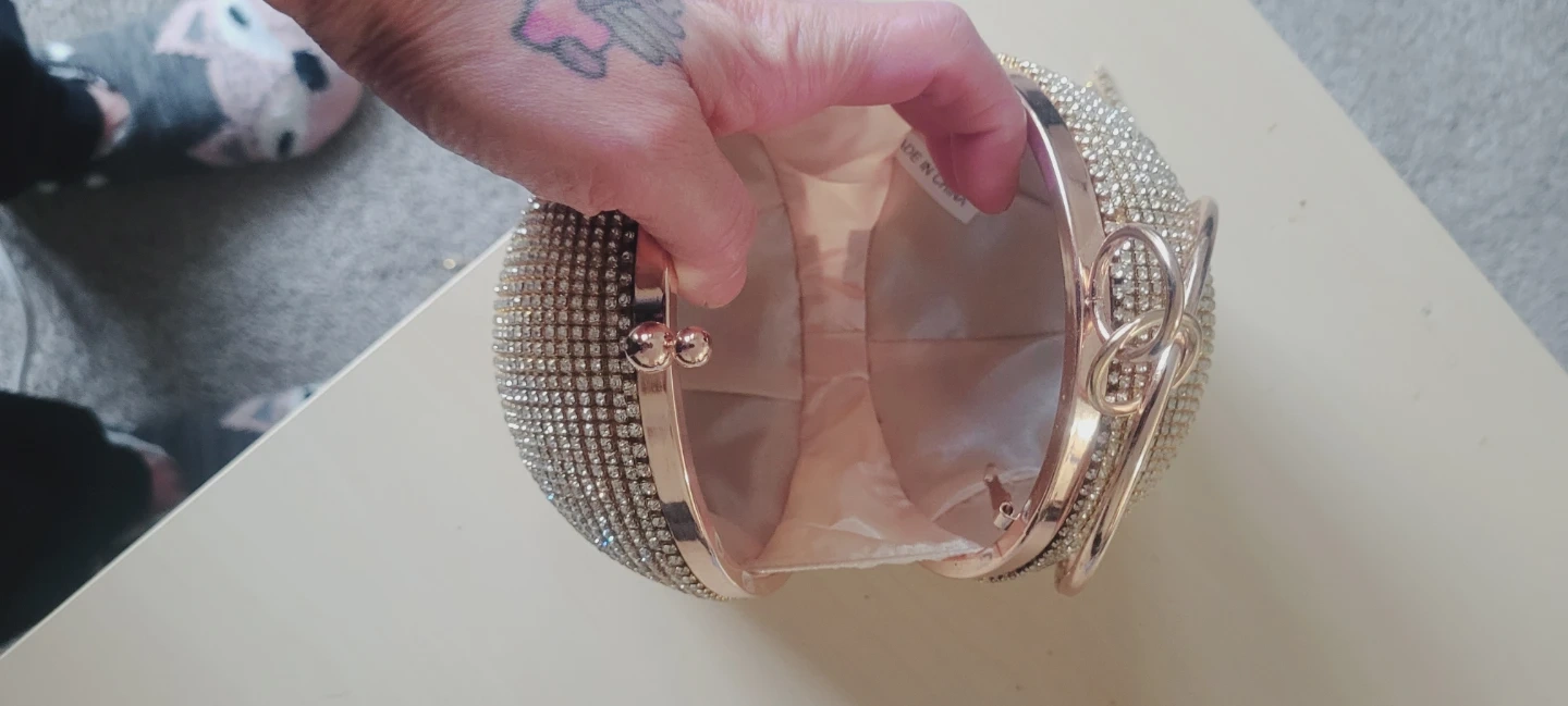 This unique ball-shaped clutch purse is covered in sparkling rhinestones and features a draped fringe detail. It has a rose gold frame and clasp closure. The interior is lined with satin fabric.
