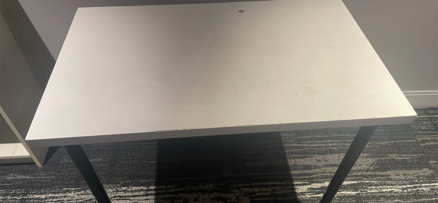 This is an IKEA LINNMON table with ADILS legs. It's white with black legs and measures 100x60 cm. It's a good size for a small workspace or as a side table.