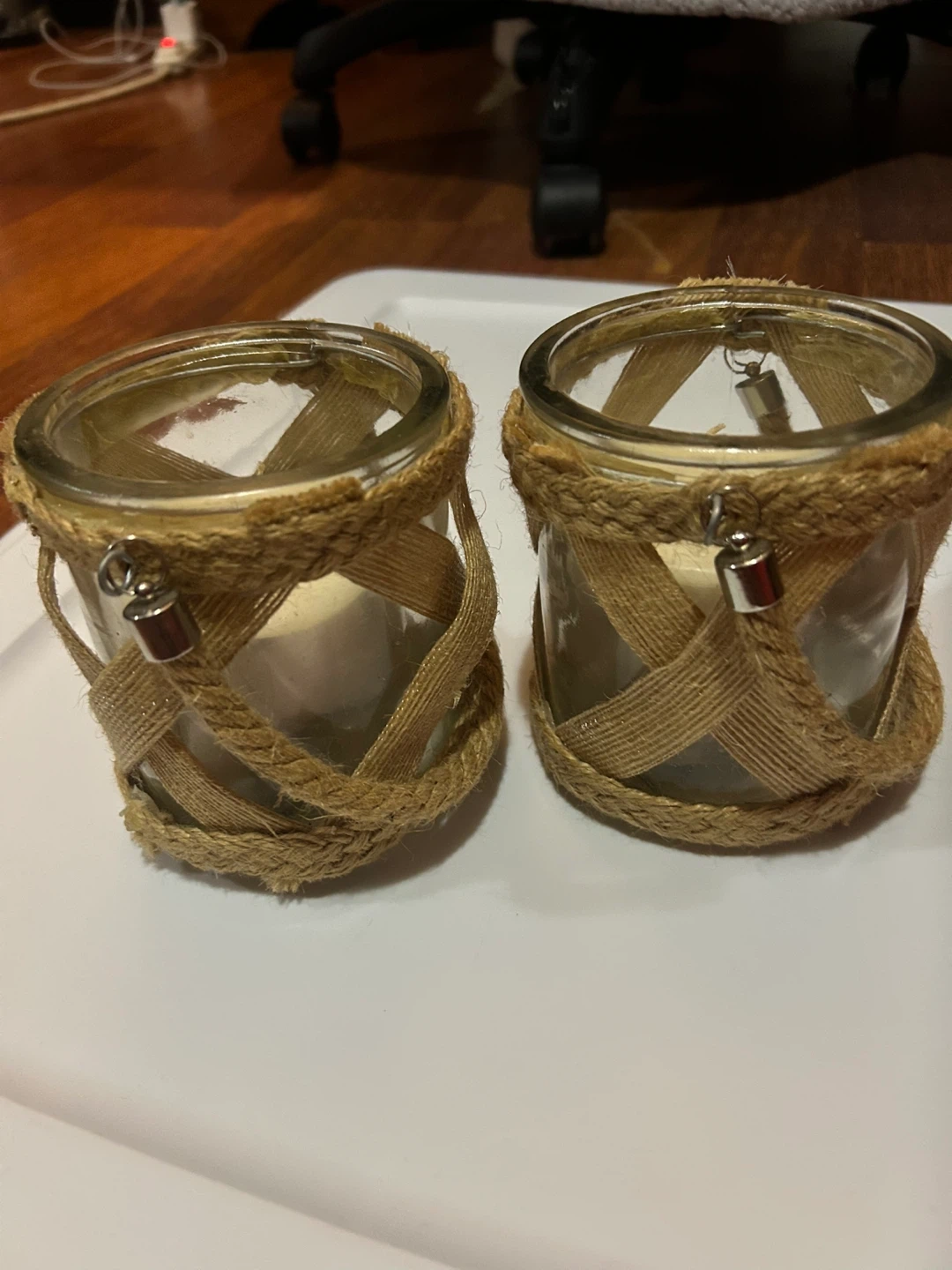 This is a set of two glass candle holders. They feature a decorative jute wrap and include cream-coloured pillar candles. Perfect for adding a cozy ambiance to any room!