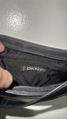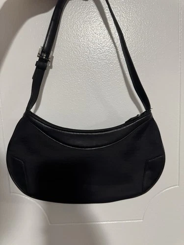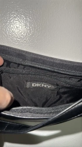 A sleek, Y2K-style baguette bag perfect for minimalist or "quiet luxury" looks. Made with durable black canvas featuring a subtle, tonal DKNY monogram print, paired with smooth black leather trim. Features a trendy crescent/baguette shape with leather-reinforced corners. Hardware includes a polished silver-tone buckle on the adjustable leather shoulder strap. Interior is fully lined in black fabric with an internal zippered security pocket. A classic "under-the-arm" shoulder bag that transitions easily from day to night.