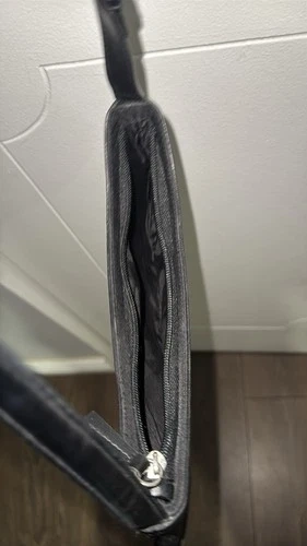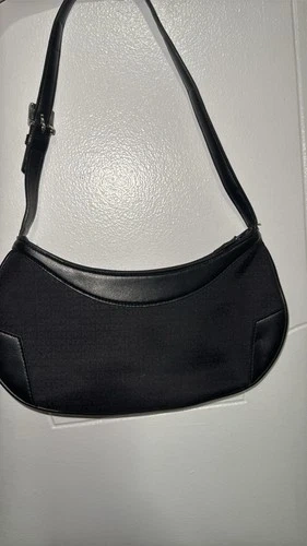 A sleek, Y2K-style baguette bag perfect for minimalist or "quiet luxury" looks. Made with durable black canvas featuring a subtle, tonal DKNY monogram print, paired with smooth black leather trim. Features a trendy crescent/baguette shape with leather-reinforced corners. Hardware includes a polished silver-tone buckle on the adjustable leather shoulder strap. Interior is fully lined in black fabric with an internal zippered security pocket. A classic "under-the-arm" shoulder bag that transitions easily from day to night.