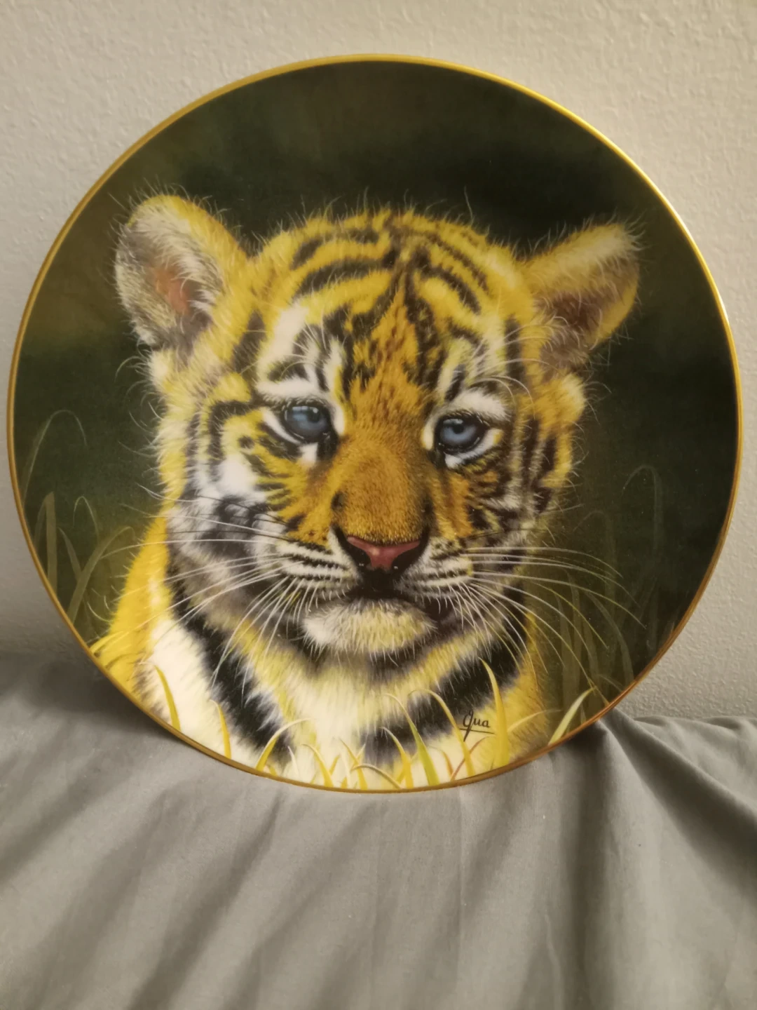 This decorative plate features a cute tiger cub from the Cubs of the Big Cats Collection. It's made by Princeton Gallery. The plate's design is by Jua. This would make a nice addition to a collection!