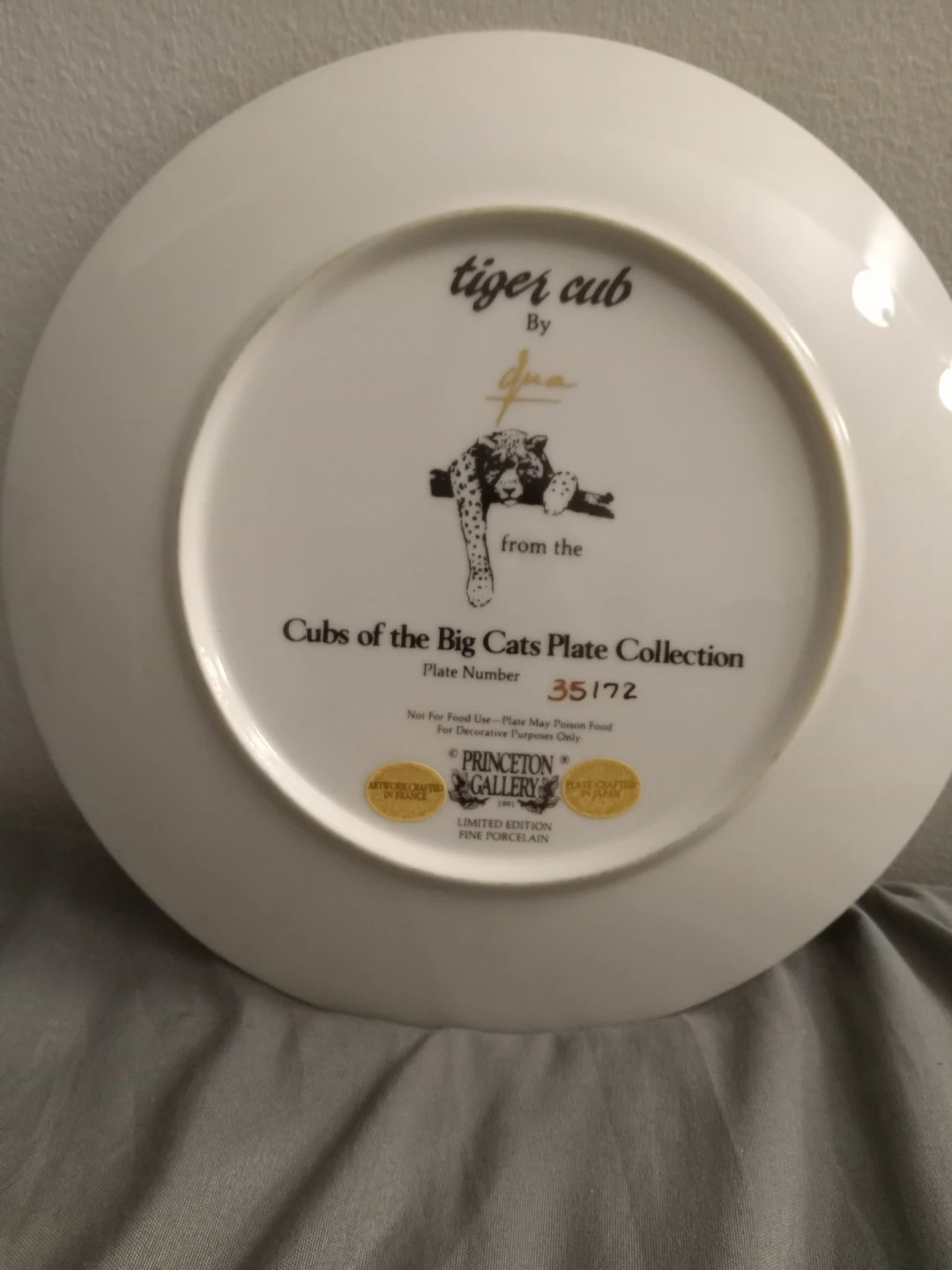 This decorative plate features a cute tiger cub from the Cubs of the Big Cats Collection. It's made by Princeton Gallery. The plate's design is by Jua. This would make a nice addition to a collection!