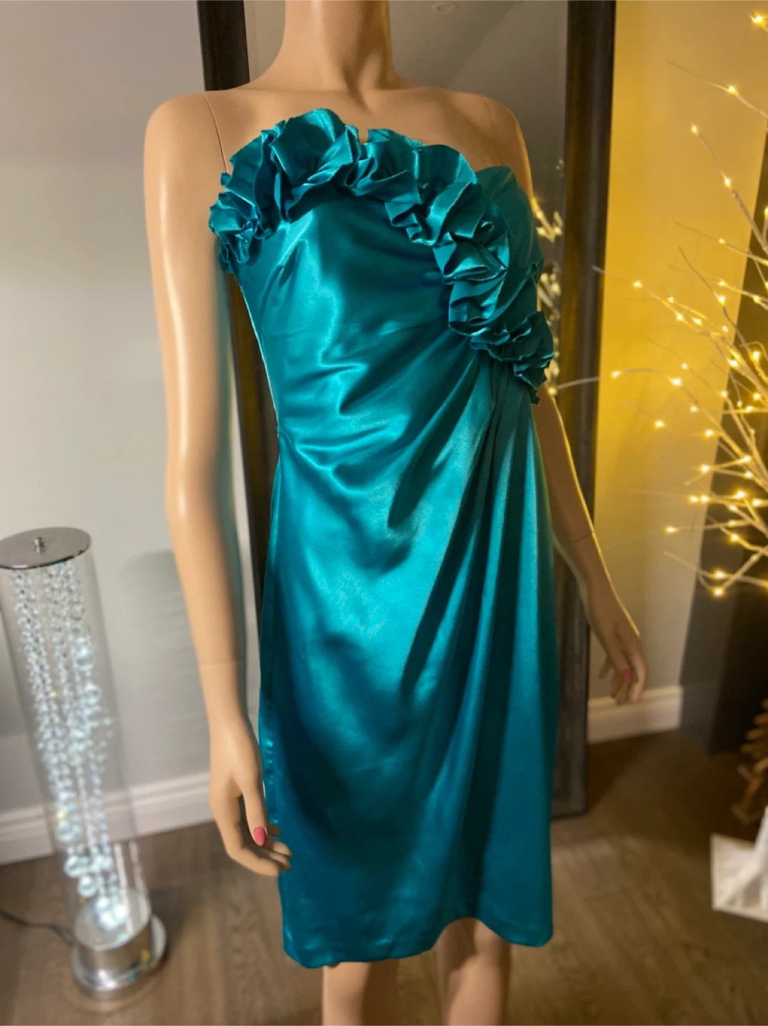 Strapless teal satin dress with beautiful flattering ruched bodice and floral accents. Perfect for a special occasion or a night out!