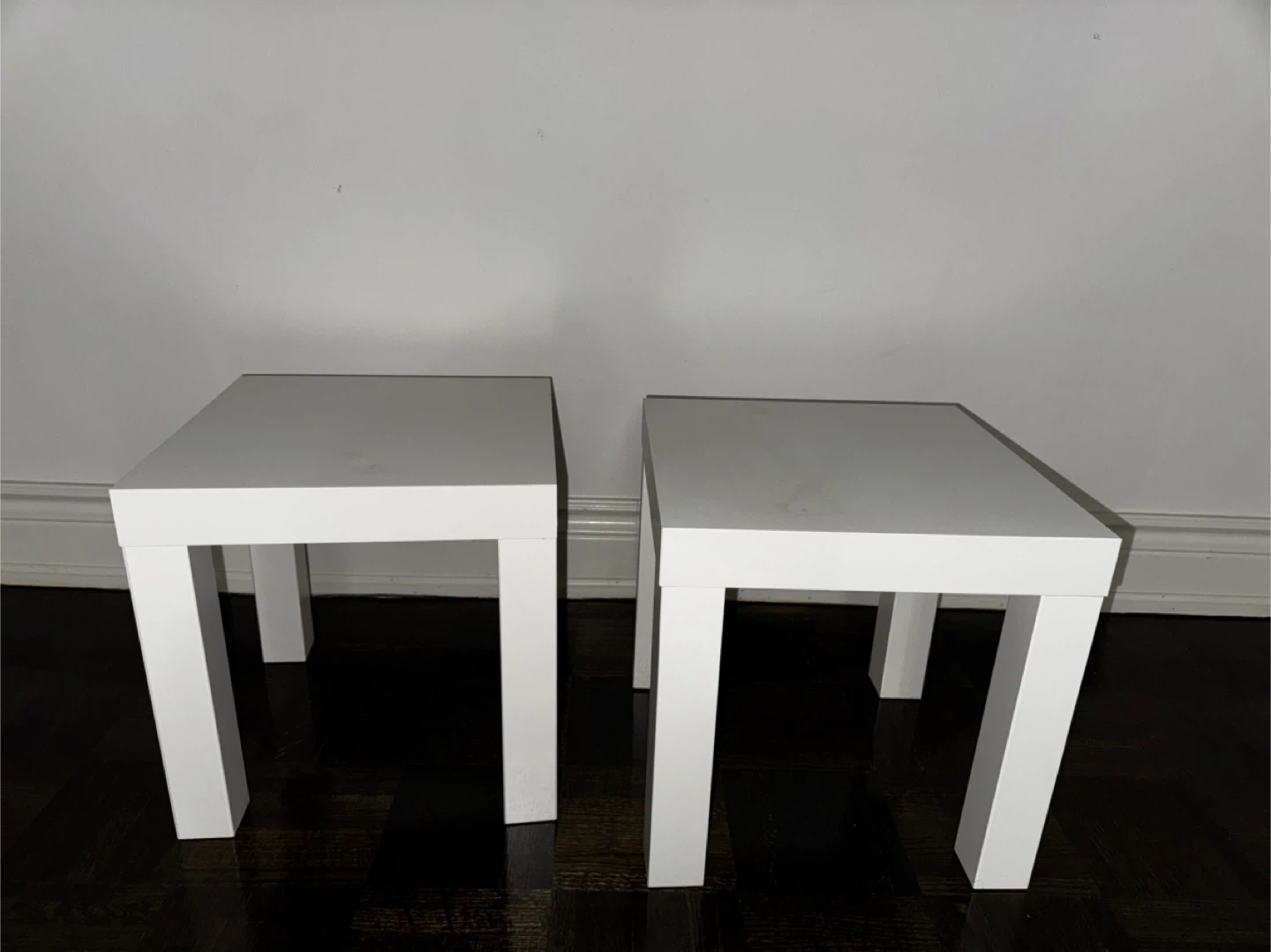 This IKEA LACK small table complements any room with its minimalist Scandinavian design. Perfect as a nightstand, plant stand, or side table, it can slide under the larger table to save space or be used separately wherever you need a functional surface.