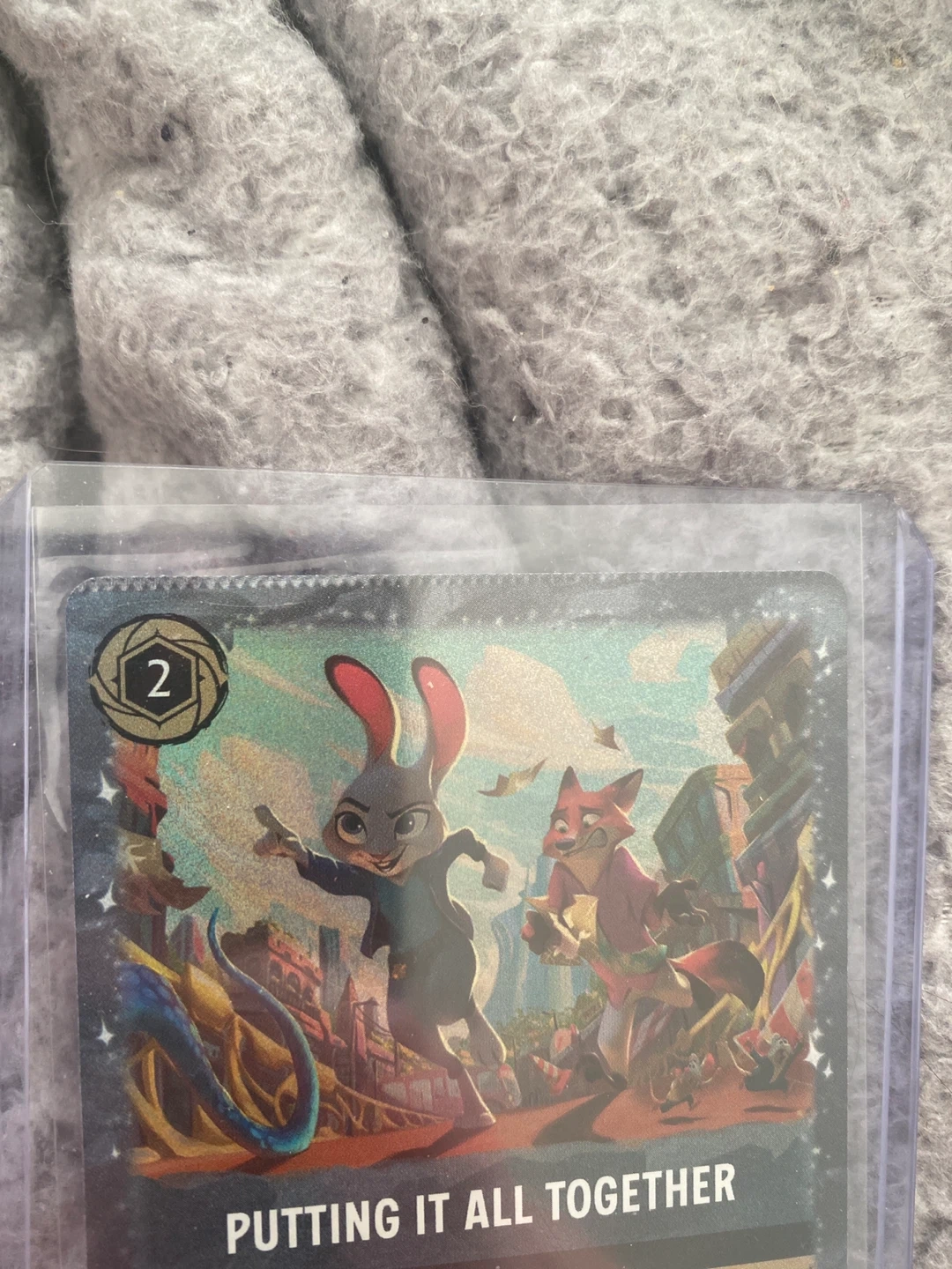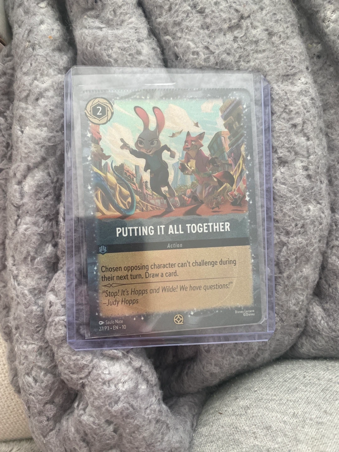 Putting It All Together" action card from Disney Lorcana. It features Judy Hopps and Nick Wilde. The card grants the ability for a chosen opposing character to not challenge during their next turn, and lets you draw a card. This action card is part of the "Rise of the Floodborn" set. movie exclusive.