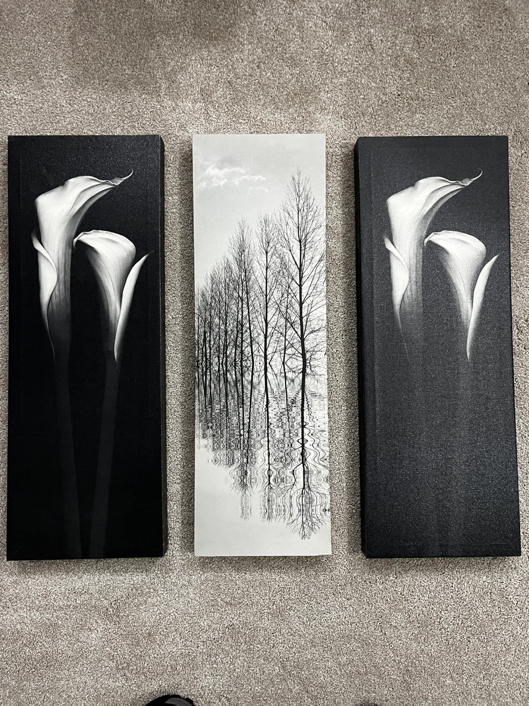 This set includes three distinct wall art prints. Two prints feature striking black and white images of calla lilies against a dark background. The third print displays a serene black and white landscape with bare trees reflected in water. These pieces would add a touch of modern elegance to any room.