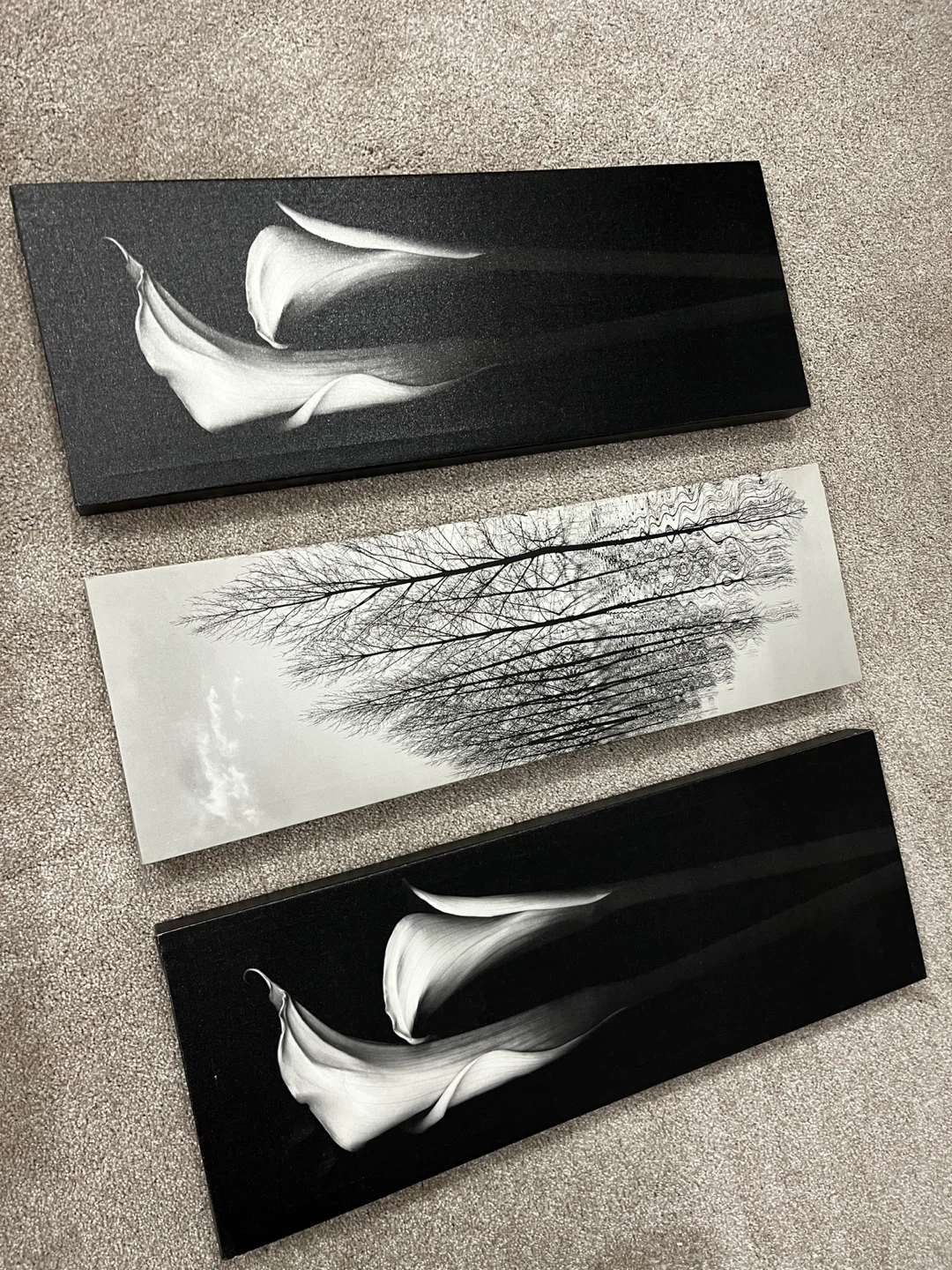 This set includes three distinct wall art prints. Two prints feature striking black and white images of calla lilies against a dark background. The third print displays a serene black and white landscape with bare trees reflected in water. These pieces would add a touch of modern elegance to any room.