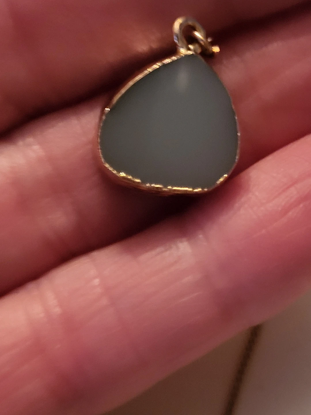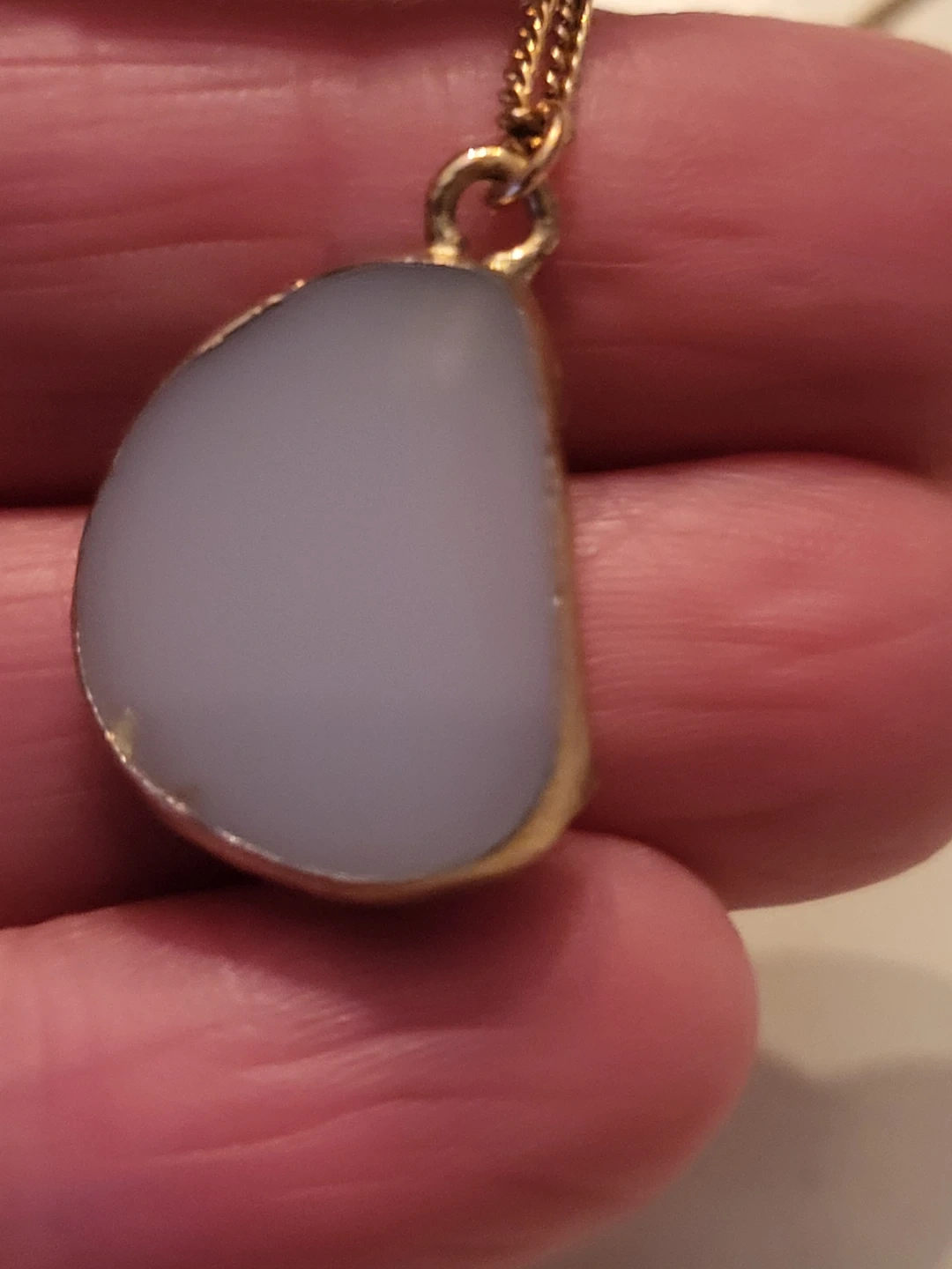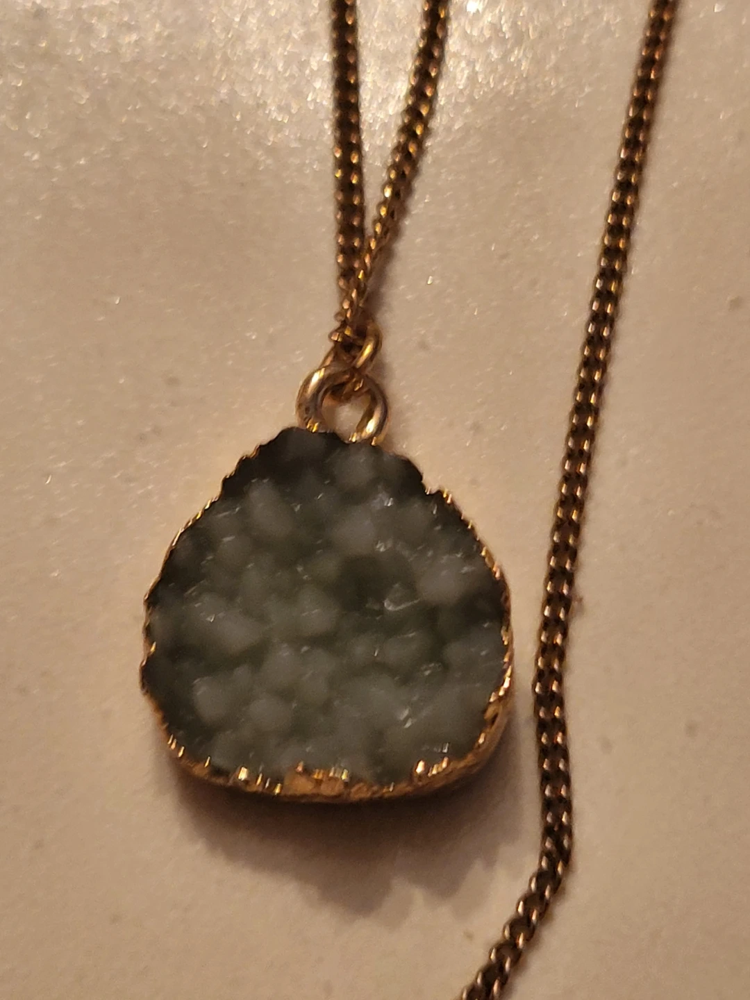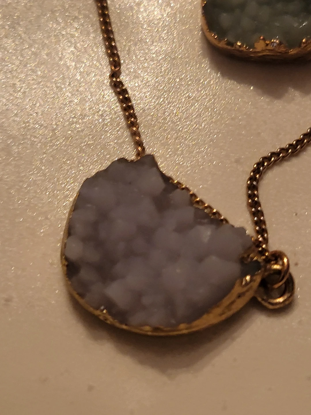 This set features a double layered necklace with druzy pendants. One pendant is greyish-white and the other is a light green. The chains and pendant settings are gold-toned.