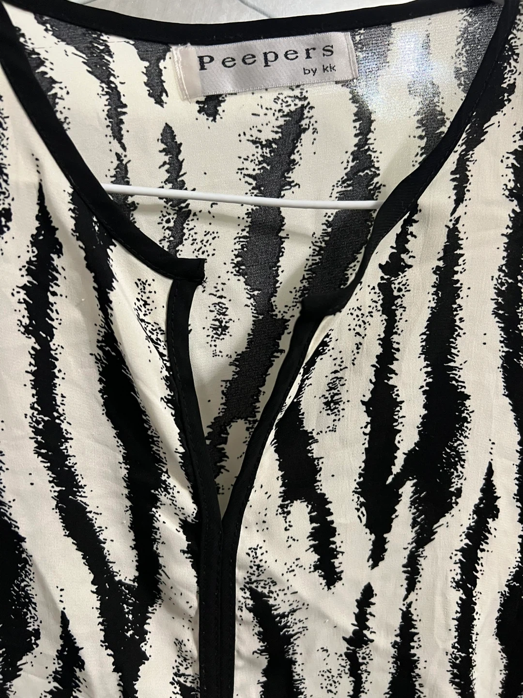 Peepers by KK women's long-sleeve blouse with a black and white animal print. It features a V-neckline with black trim. This top is perfect for adding a touch of wild style to your wardrobe!