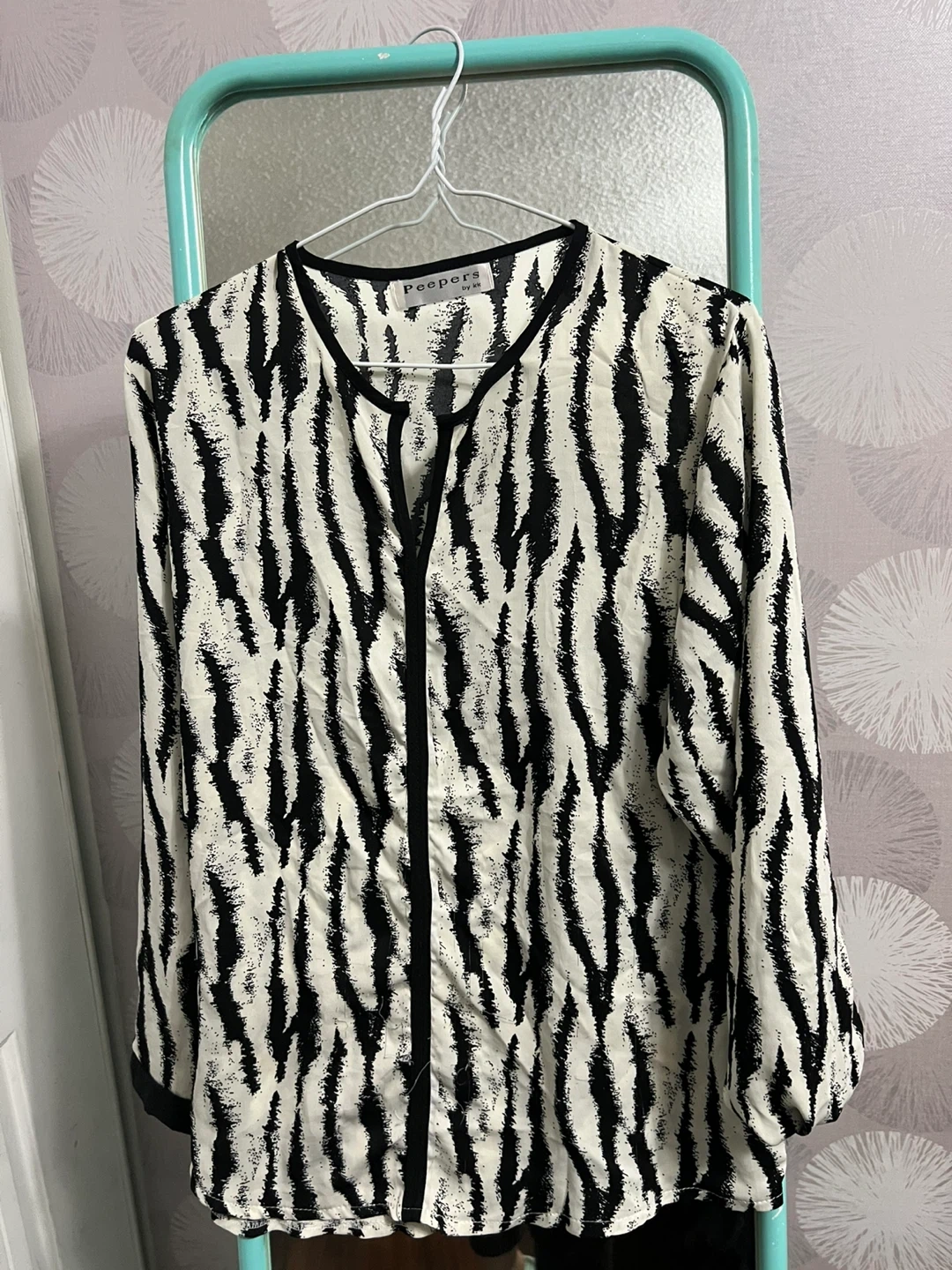 Peepers by KK women's long-sleeve blouse with a black and white animal print. It features a V-neckline with black trim. This top is perfect for adding a touch of wild style to your wardrobe!