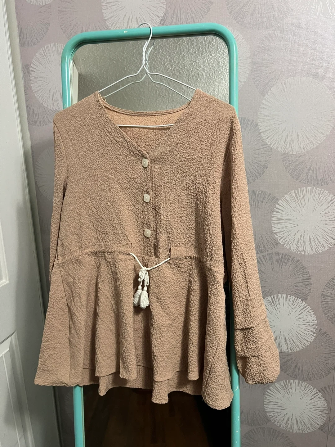 A beige textured peplum blouse with long sleeves and decorative buttons. It has a drawstring waist detail with tassels. Material is a lightweight textured fabric.