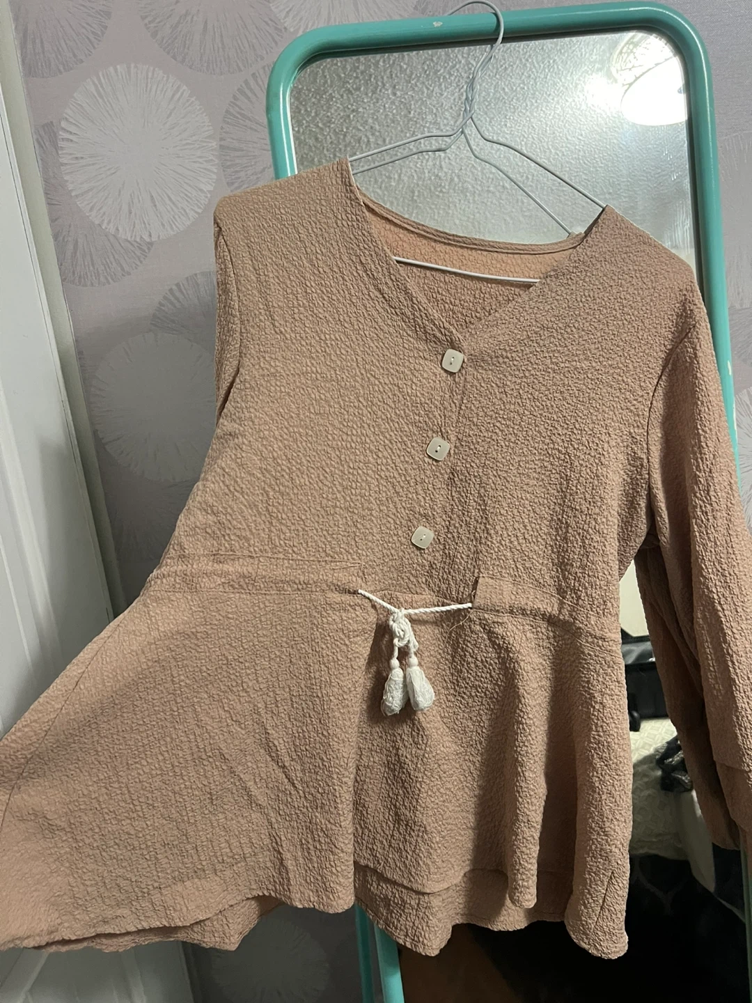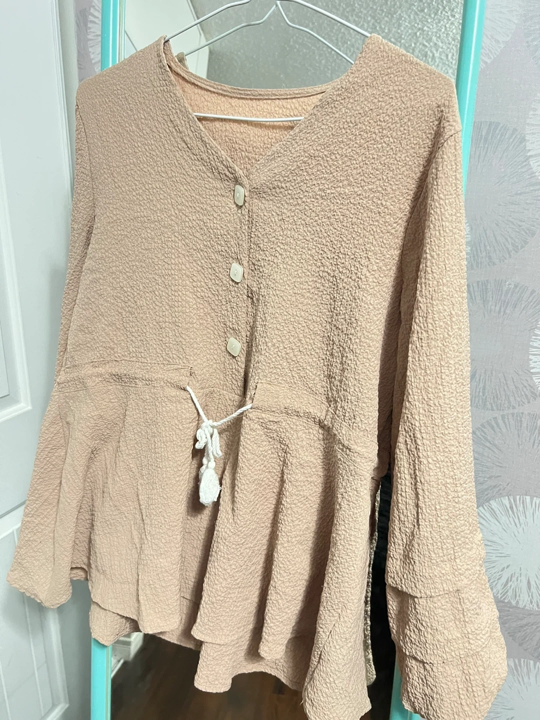 A beige textured peplum blouse with long sleeves and decorative buttons. It has a drawstring waist detail with tassels. Material is a lightweight textured fabric.