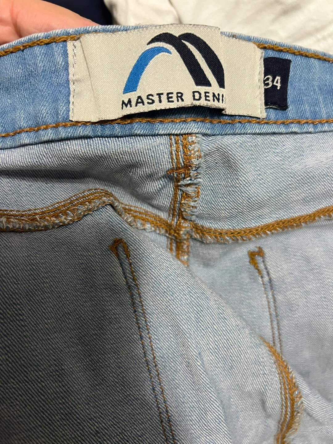 These are light wash denim jeans by Master Denim. They're a size 34 waist. Comfortable for everyday wear!