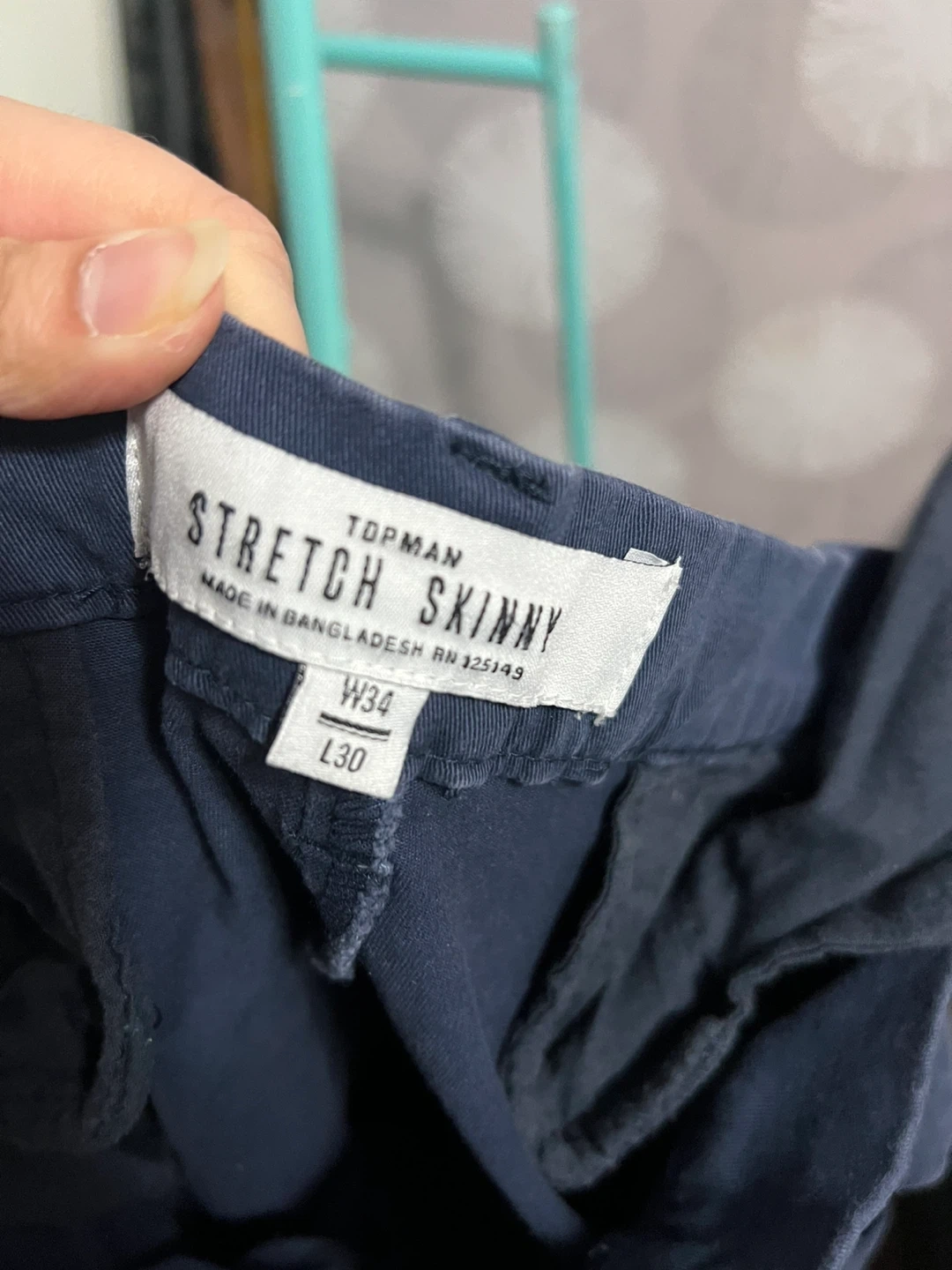 Navy blue Topman stretch skinny fit trousers. Waist size is W34 and leg length is L30. These trousers are made from a comfortable stretch fabric.