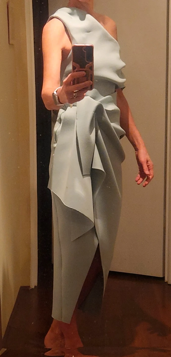 Elegant light blue midi dress with one-shoulder design and dramatic draping. Super flattering. Light snags on one side and that's why it is heavily discounted. Bought for 150 and selling for 50.