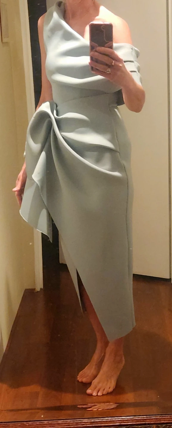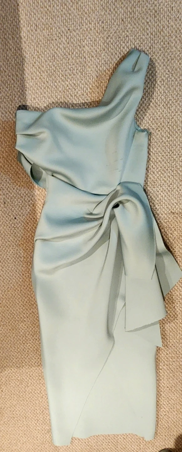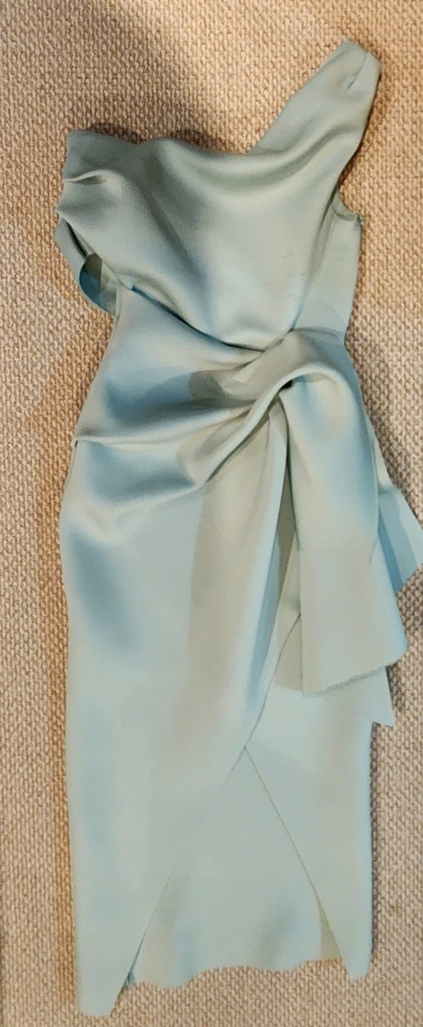 Elegant light blue midi dress with one-shoulder design and dramatic draping. Super flattering. Light snags on one side and that's why it is heavily discounted. Bought for 150 and selling for 50.