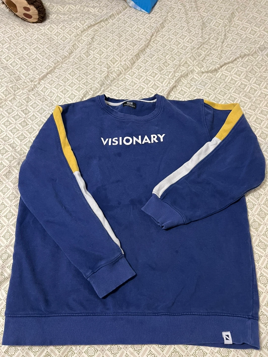 This blue crewneck sweatshirt features "VISIONARY" printed on the front. It has yellow and white stripe detailing on the sleeves. Made from a comfortable cotton blend.