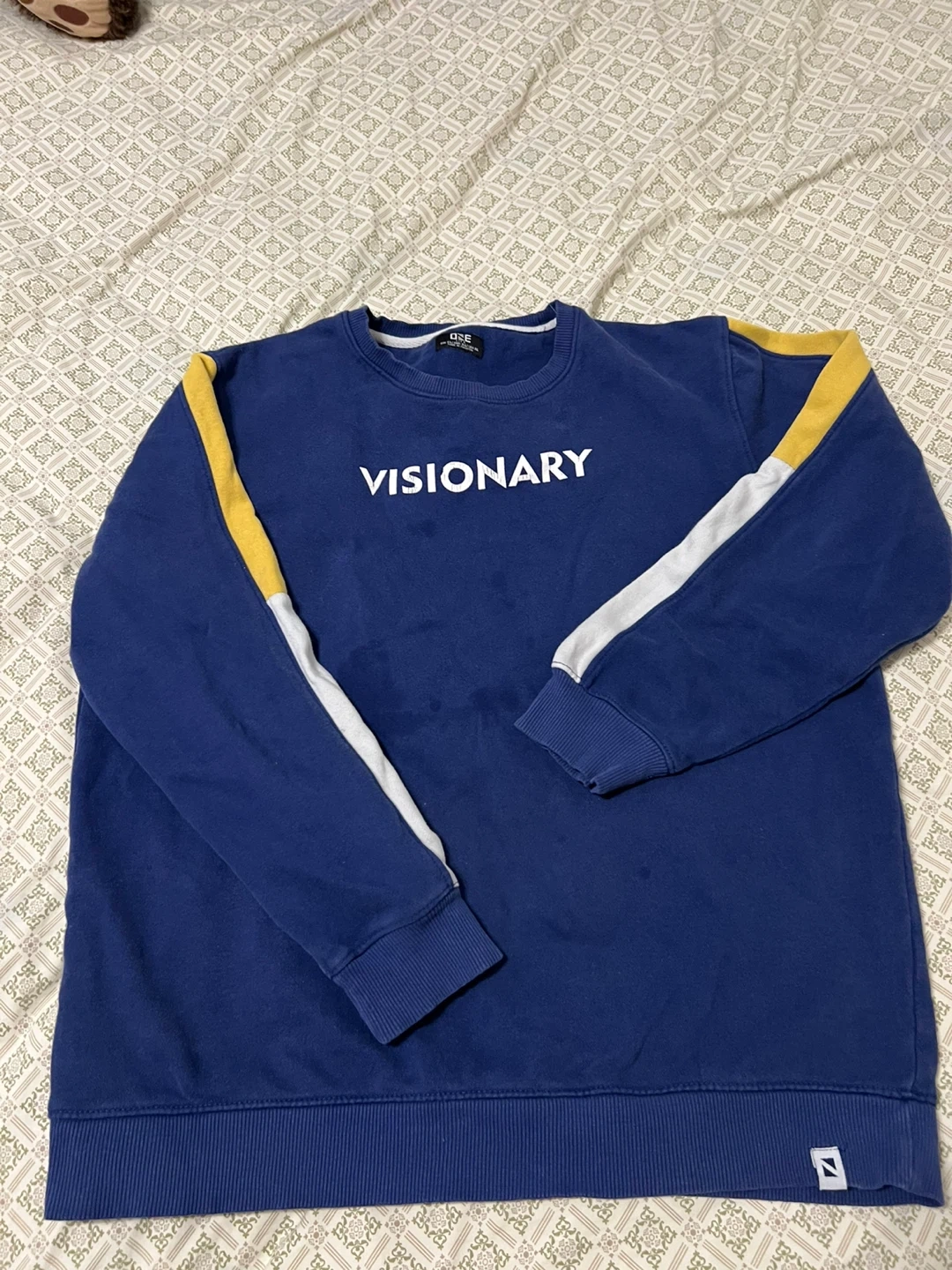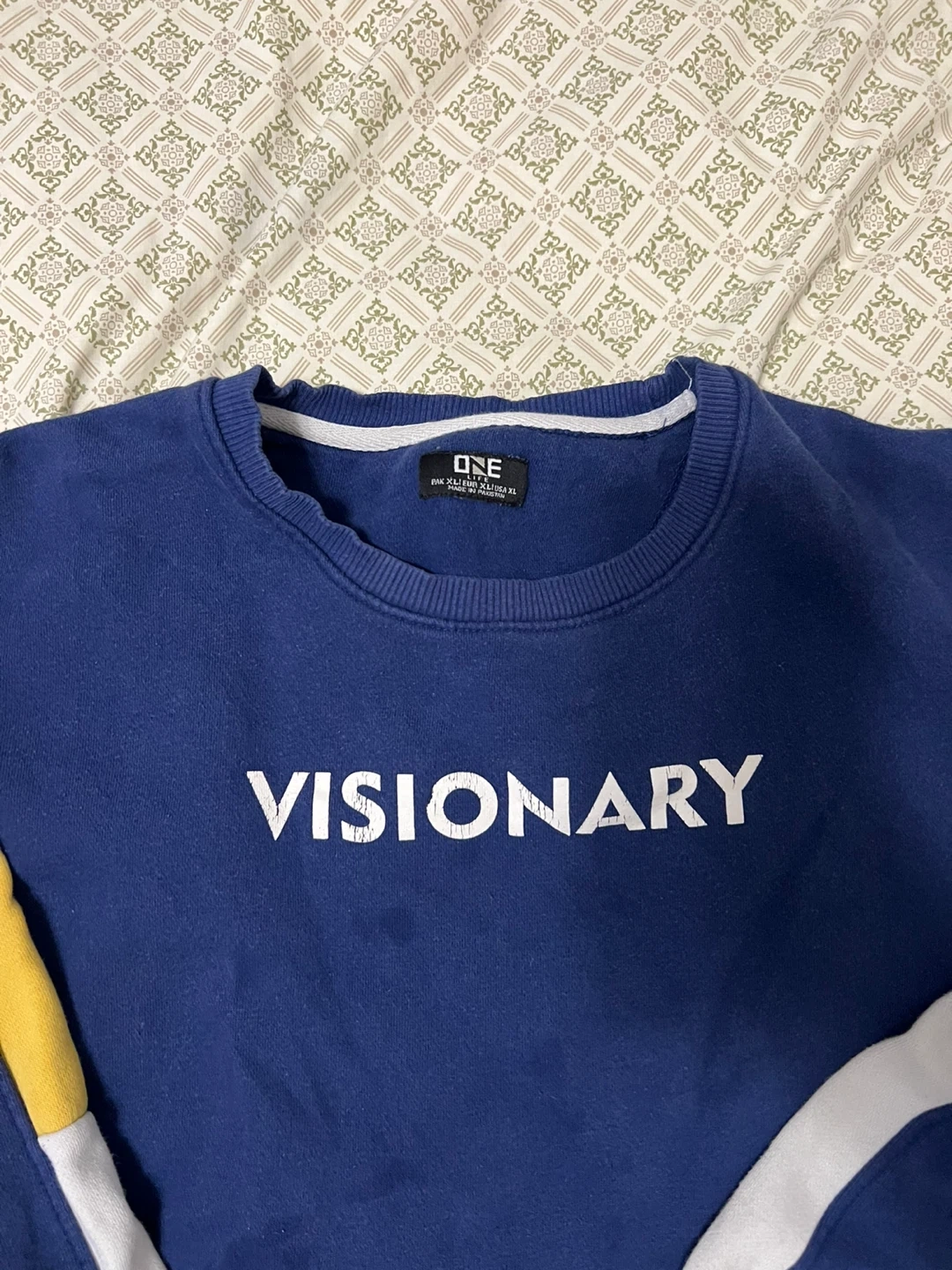 This blue crewneck sweatshirt features "VISIONARY" printed on the front. It has yellow and white stripe detailing on the sleeves. Made from a comfortable cotton blend.