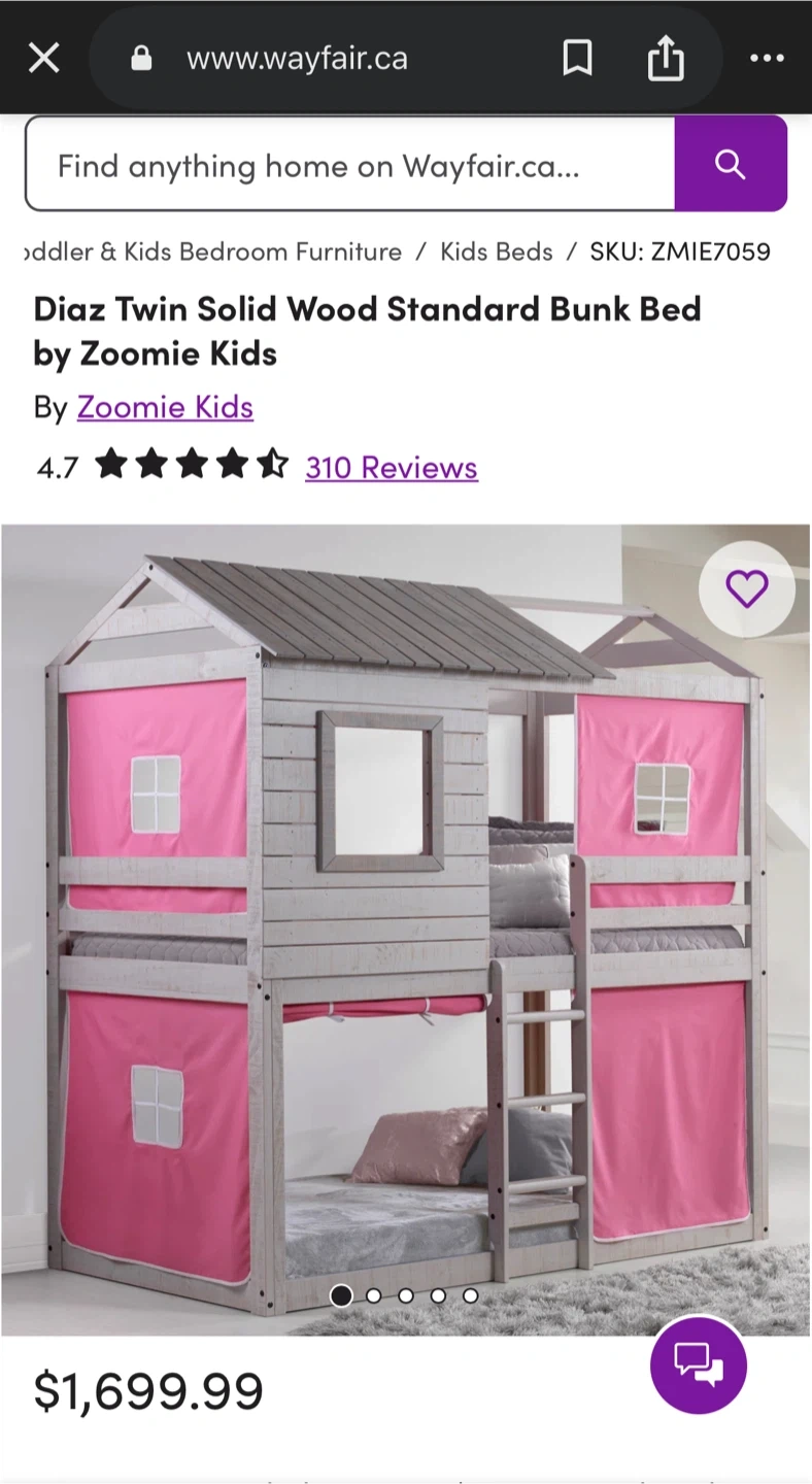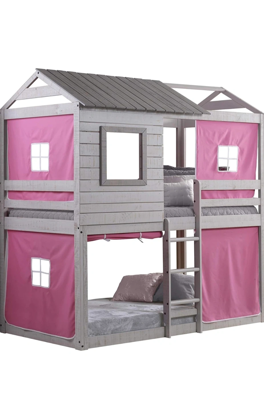 This twin over twin bunk bed has a fun house design with pink tent curtains. It's made of wood and includes a ladder for access to the top bunk. The beds measure 77 15/16" L x 41 1/16" W overall. This bed is great for kids who love imaginative play!