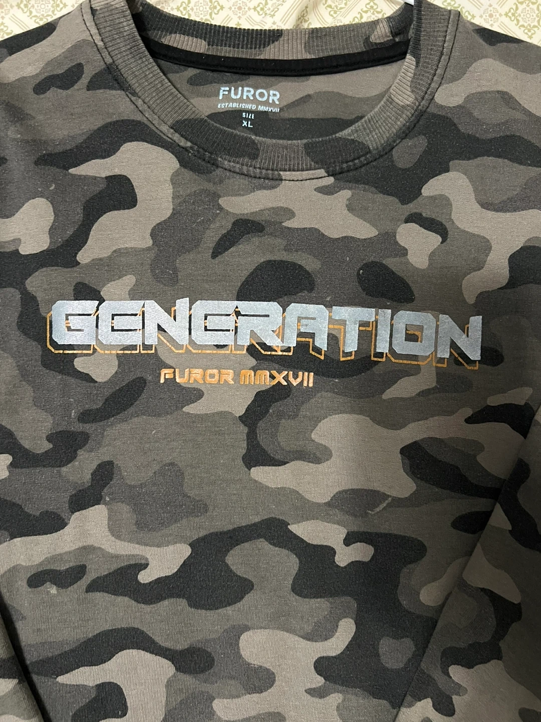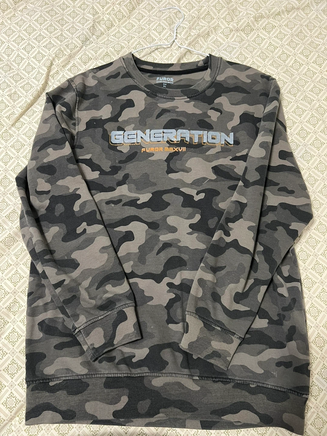 This FURO R sweatshirt features a camouflage pattern and the 'GENERATION' graphic. It's a size XL. Perfect for casual wear.