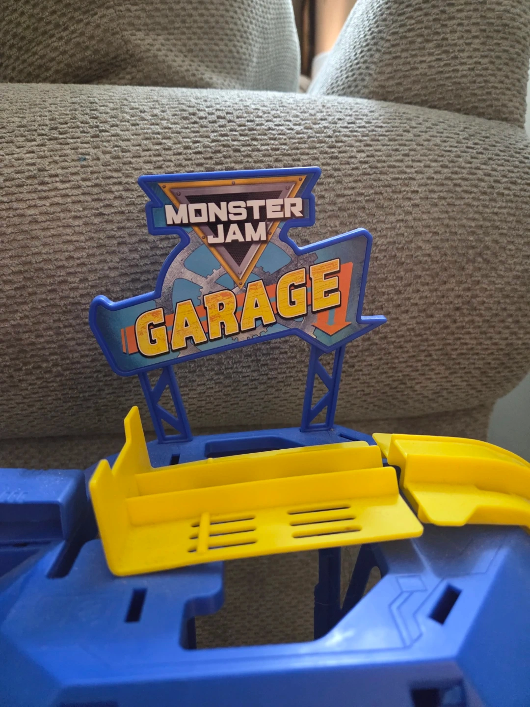 This is a Monster Jam Garage playset. It includes a garage structure with ramps and a large monster truck tire. It's made of blue and yellow plastic.