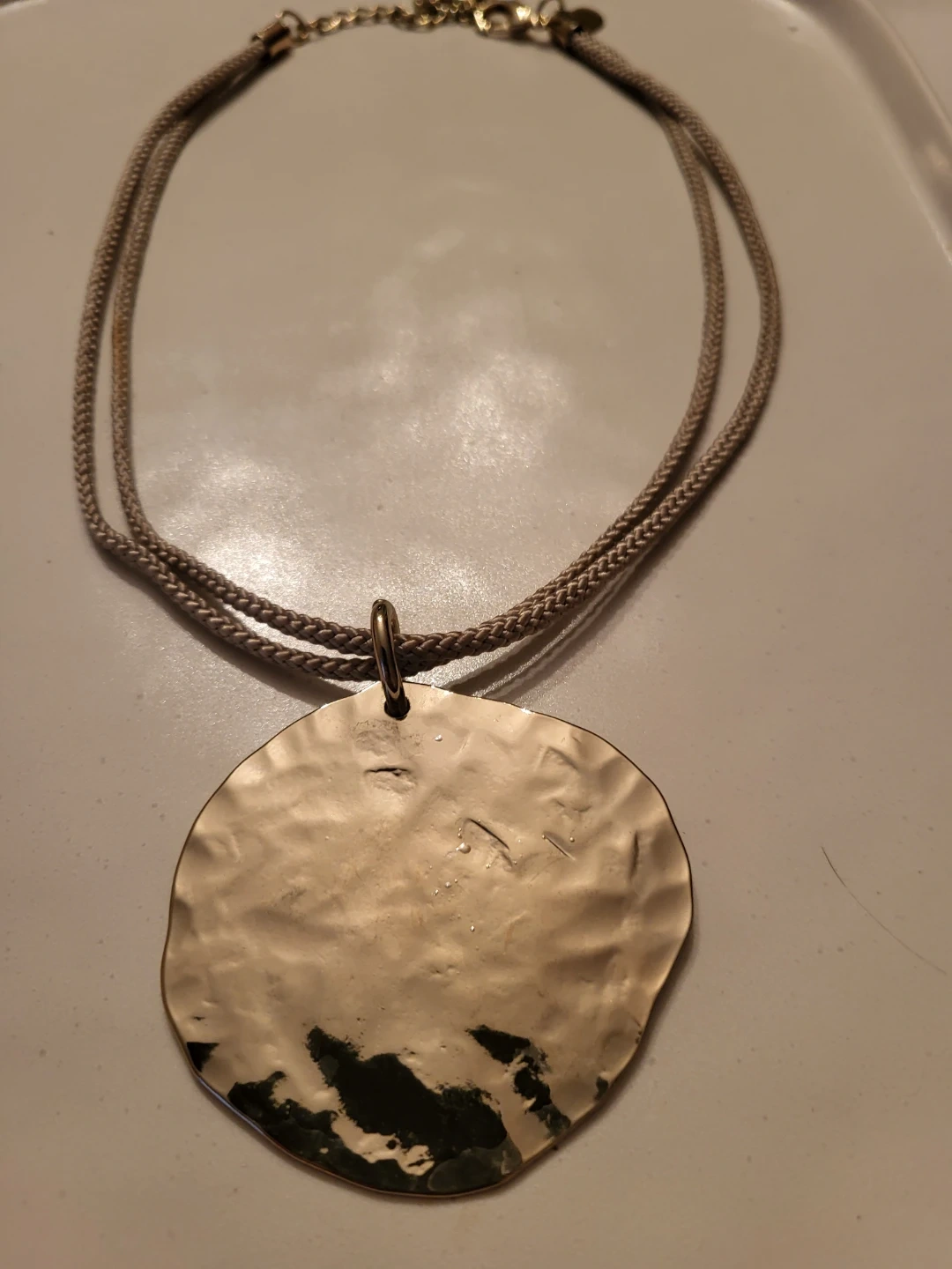 Chico's pendant necklace with a hammered silver-tone disc. It's strung on a braided cord. Features an adjustable chain with a lobster clasp.