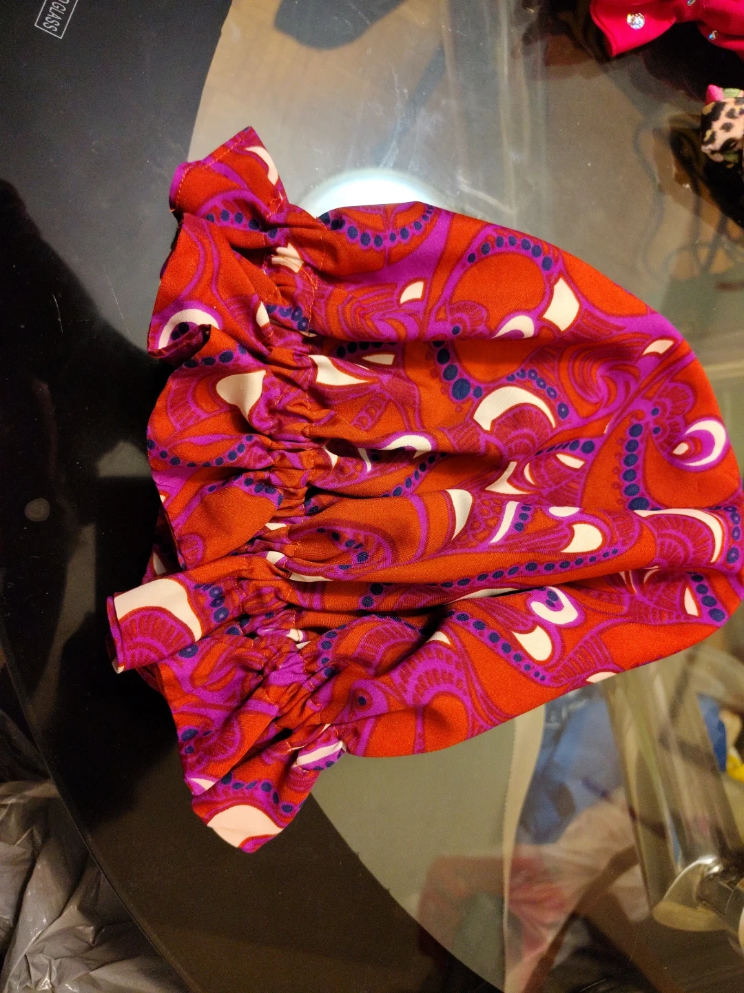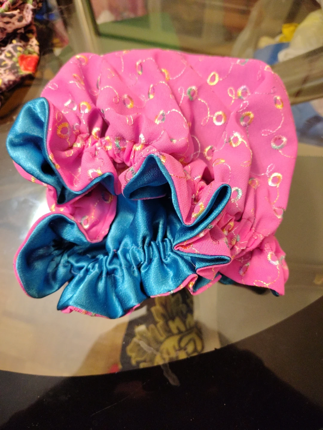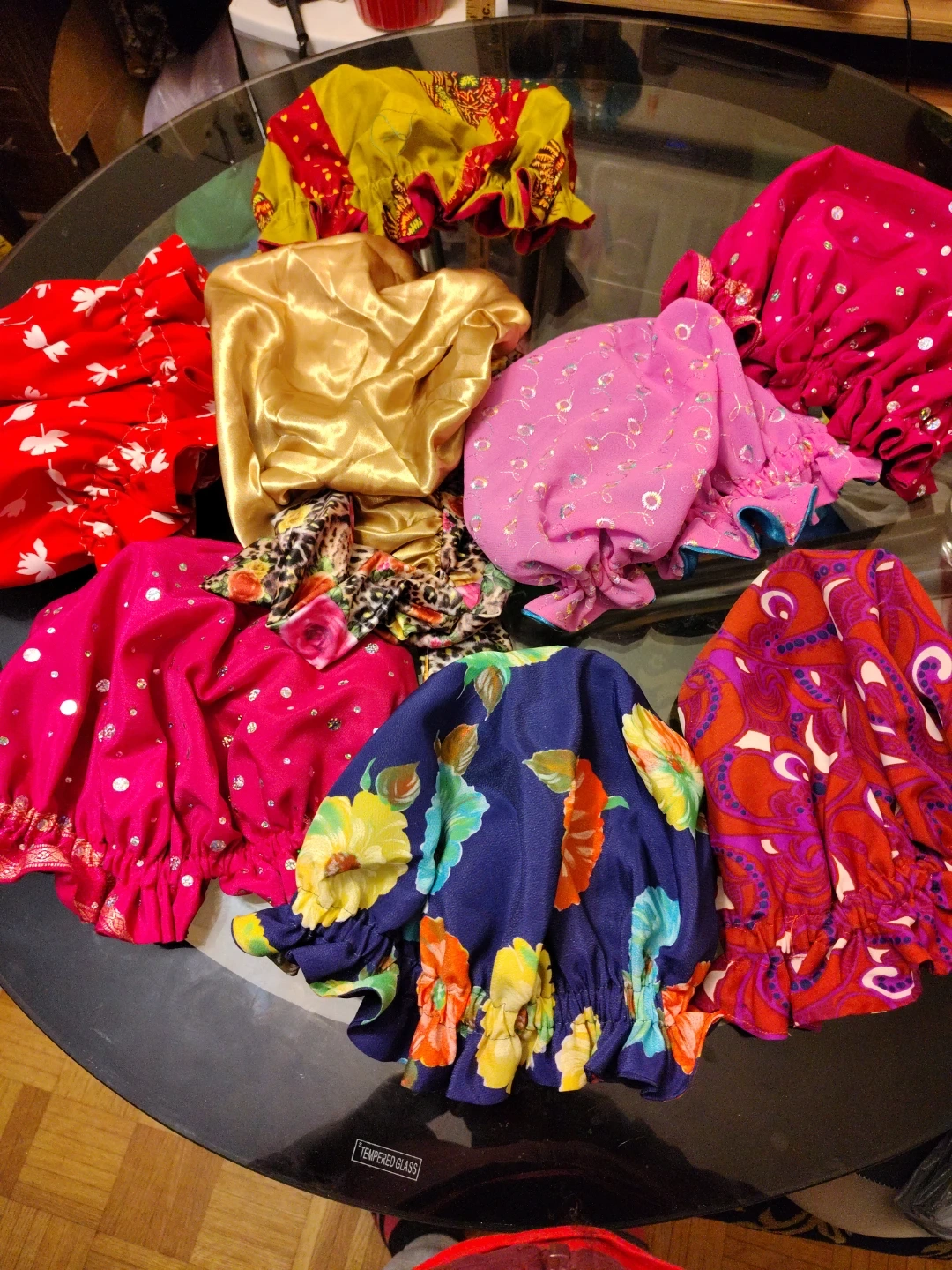 A collection of 7 hair bonnet hand made in various vibrant patterns and colours. These hair bonnet are designed to keep your hair in place when you go to sleep. They feature elasticated edges for a snug fit.