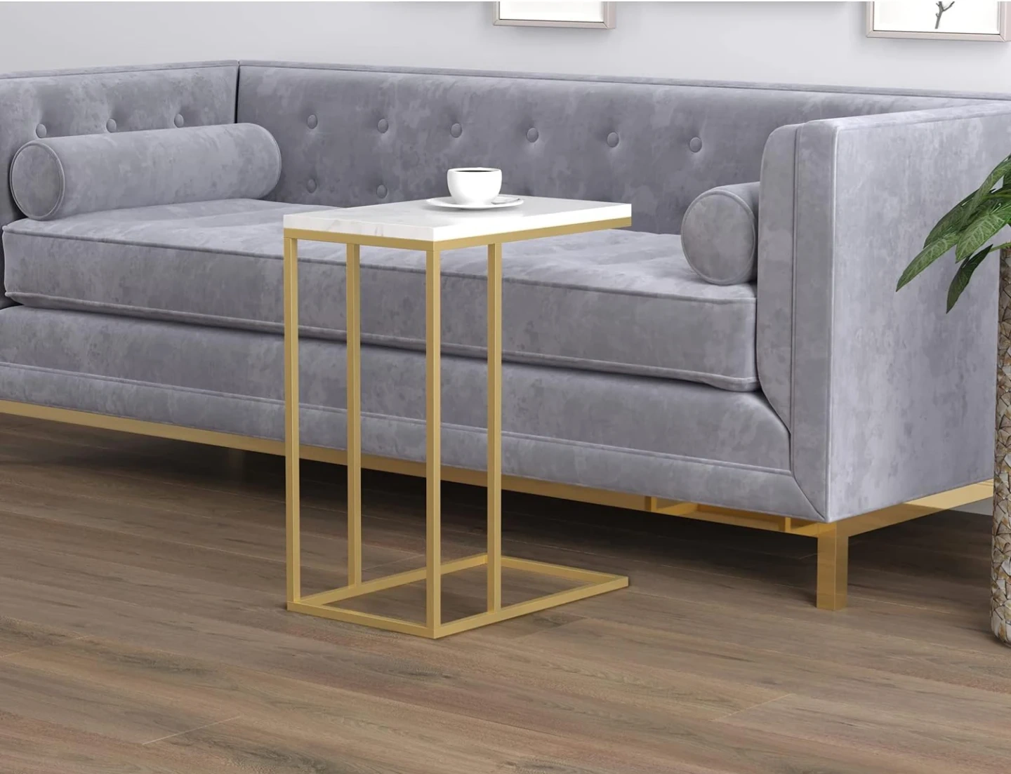 This Safdie & Co. accent table has a marble top and gold metal frame. It's 24 inches tall, 18.9 inches wide, and 11.8 inches deep. This table's C-shape makes it easy to slide under a sofa or chair.