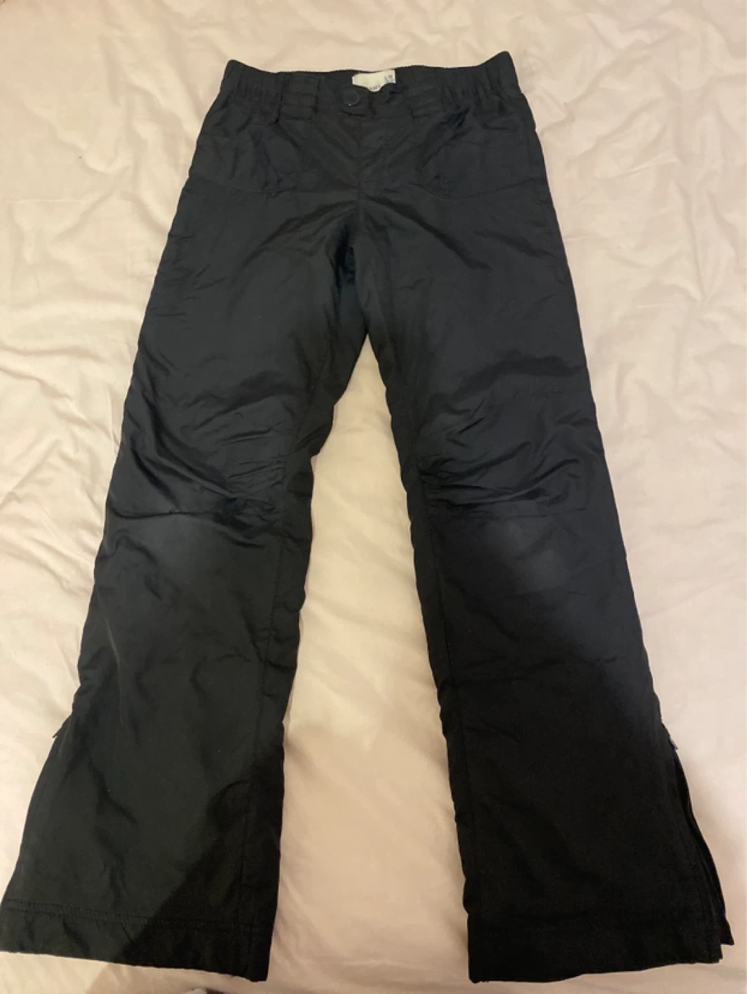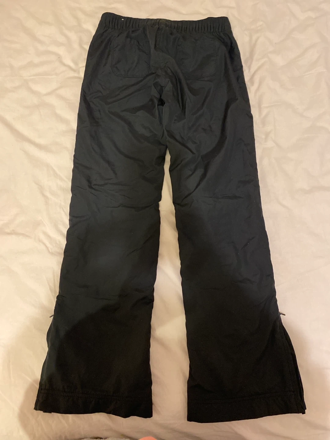 These are black ski pants. They're made of a durable nylon material. The legs have a flared opening with zippers for easy boot access.